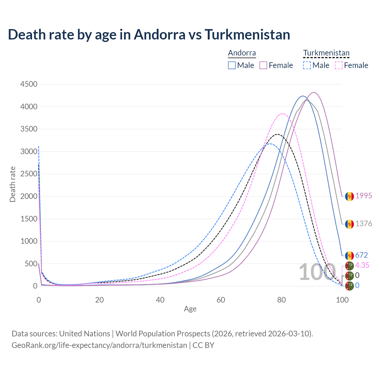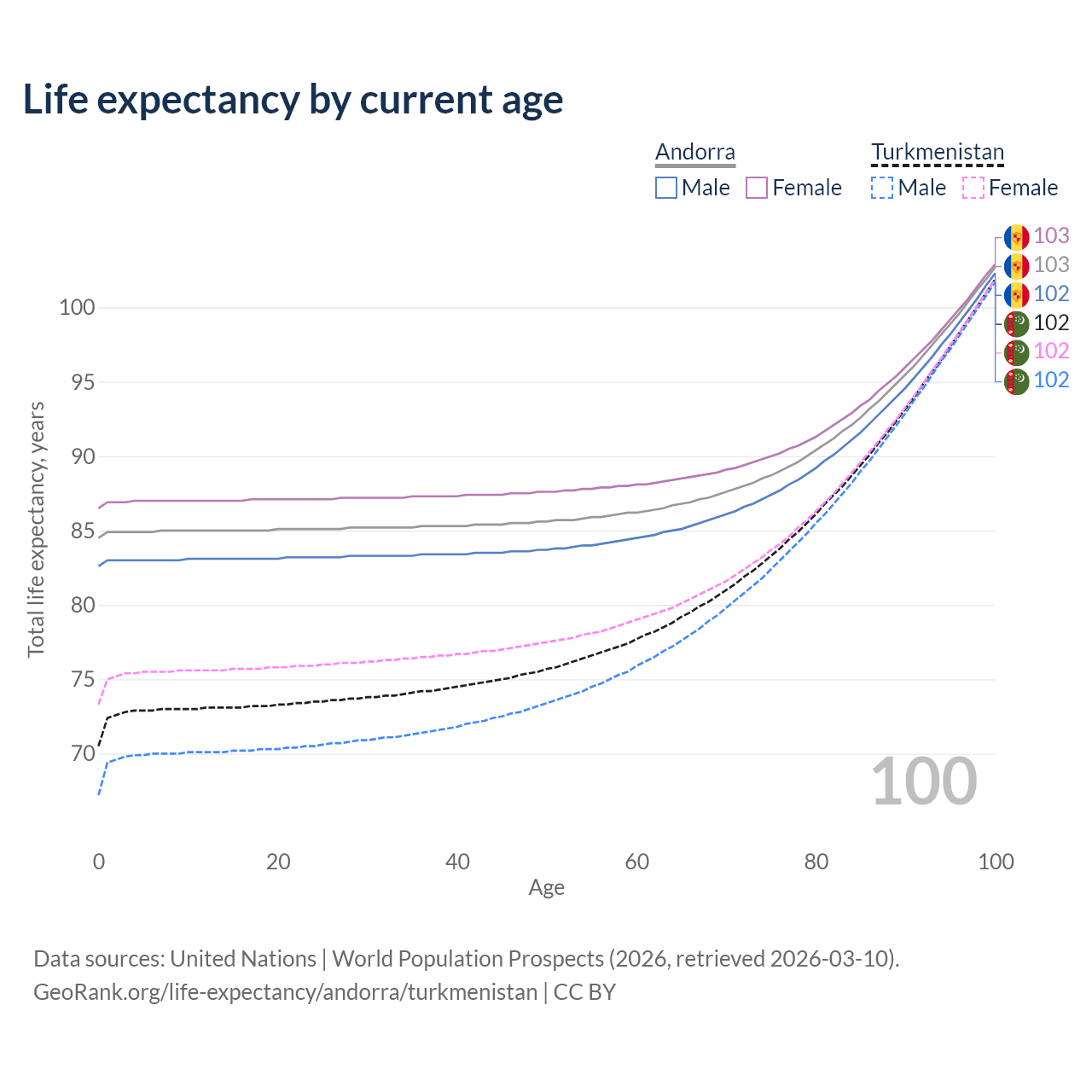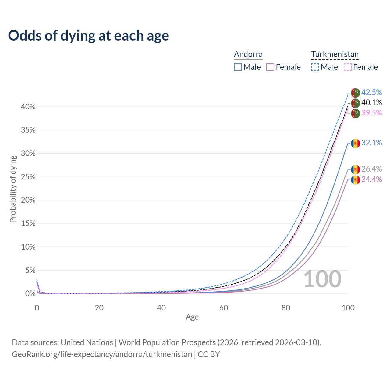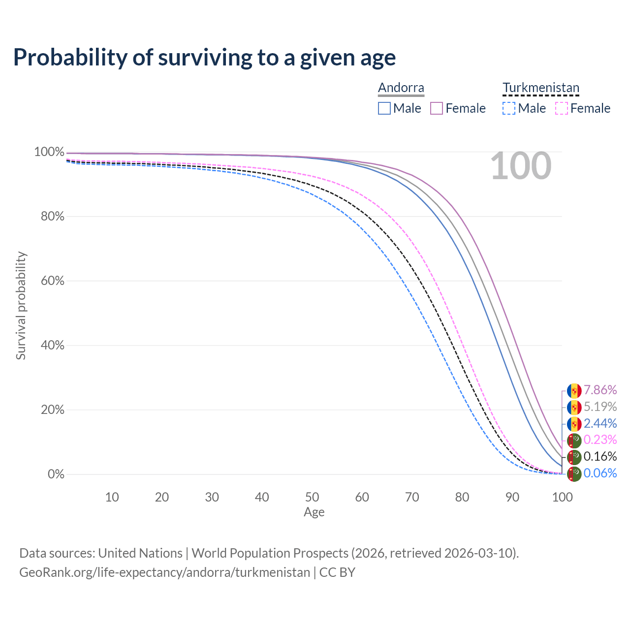 This life expectancy calculator shows the odds of living to 100, 95, 90, and below based on current age for both males and females in Andorra and Turkmenistan, along with mean and median age of death. The calculations are based on the 2026 life tables (actuarial tables) from the UN World Population Prospects.