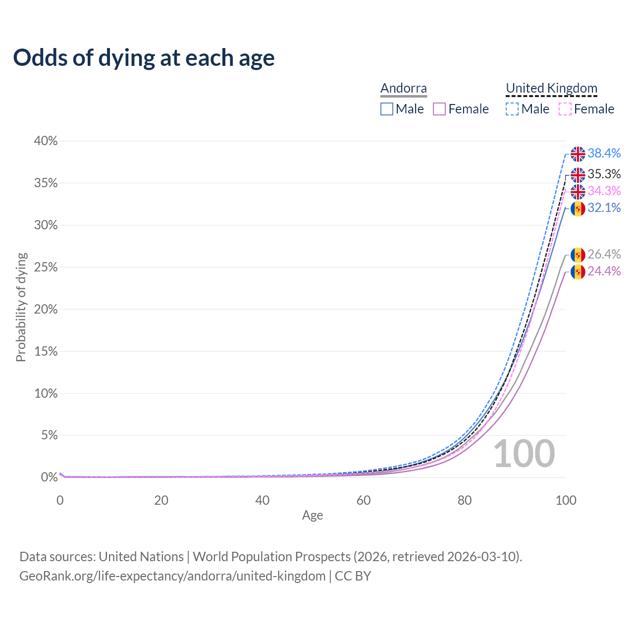 This life expectancy calculator shows the odds of living to 100, 95, 90, and below based on current age for both males and females in Andorra and the United Kingdom, along with mean and median age of death. The calculations are based on the 2026 life tables (actuarial tables) from the UN World Population Prospects.