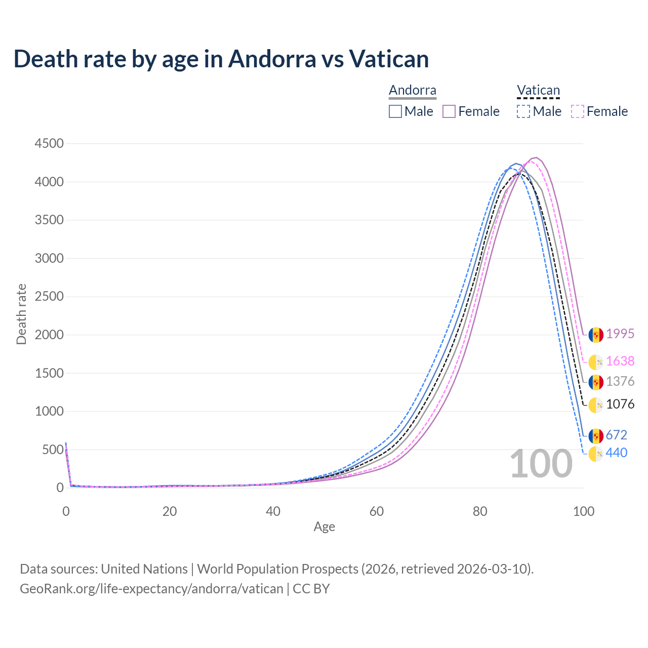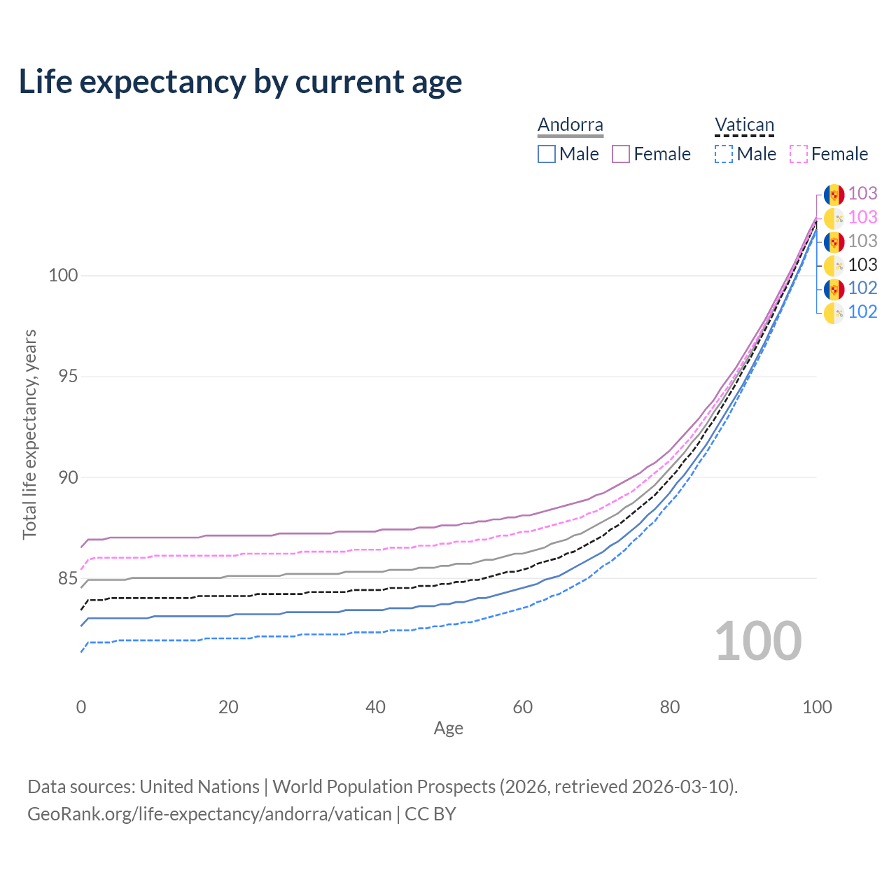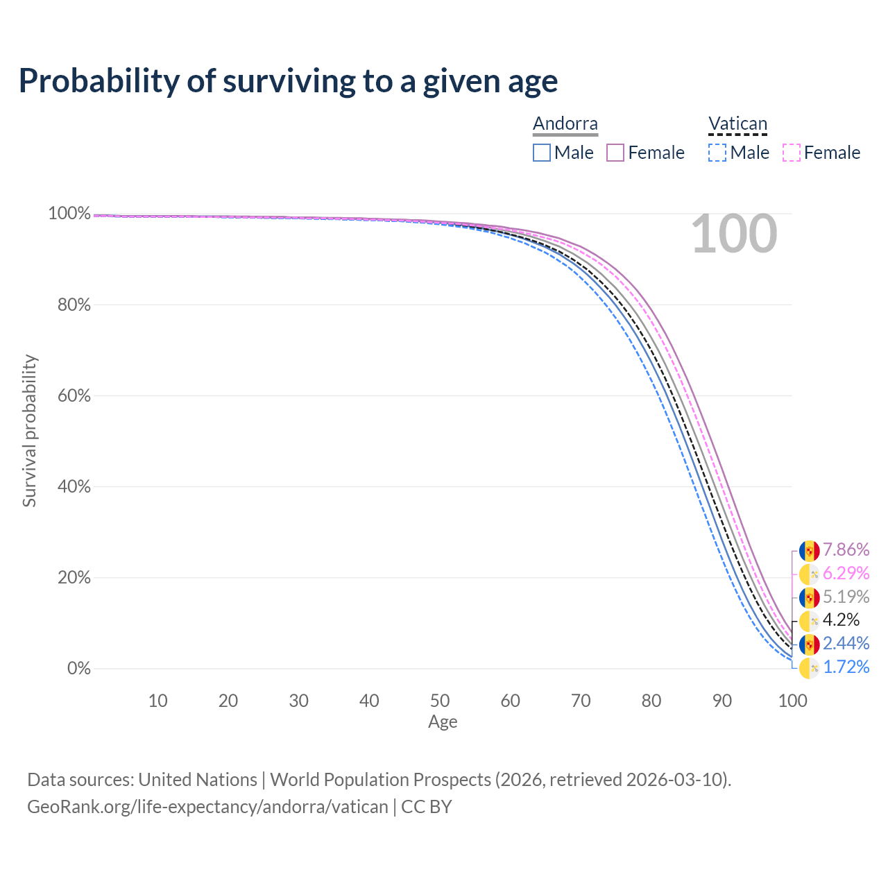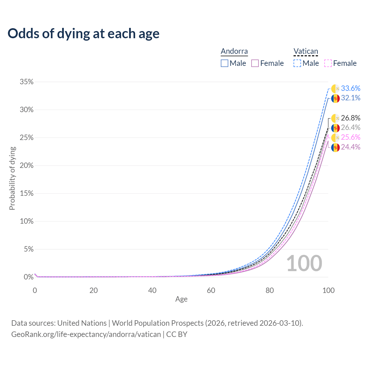This life expectancy calculator shows the odds of living to 100, 95, 90, and below based on current age for both males and females in Andorra and the Vatican, along with mean and median age of death. The calculations are based on the 2026 life tables (actuarial tables) from the UN World Population Prospects.