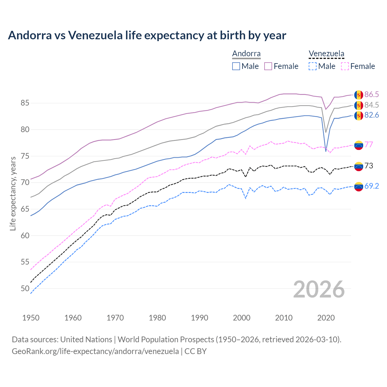The average life expectancy at birth is 84.5 years in Andorra vs 73 in Venezuela. Andorra is ranked 5/197 by life expectancy, and Venezuela is 114/197. In Andorra, the life expectancy is 82.6 years for males and 86.5 years for females. In Venezuela, it's 69.2 years for males and 77 years for females.