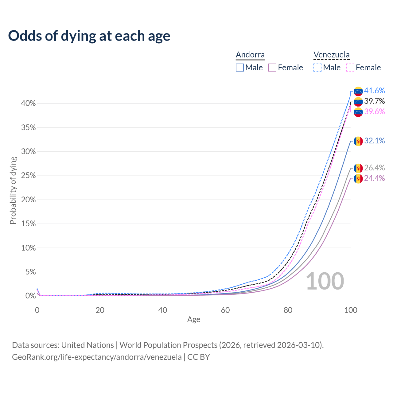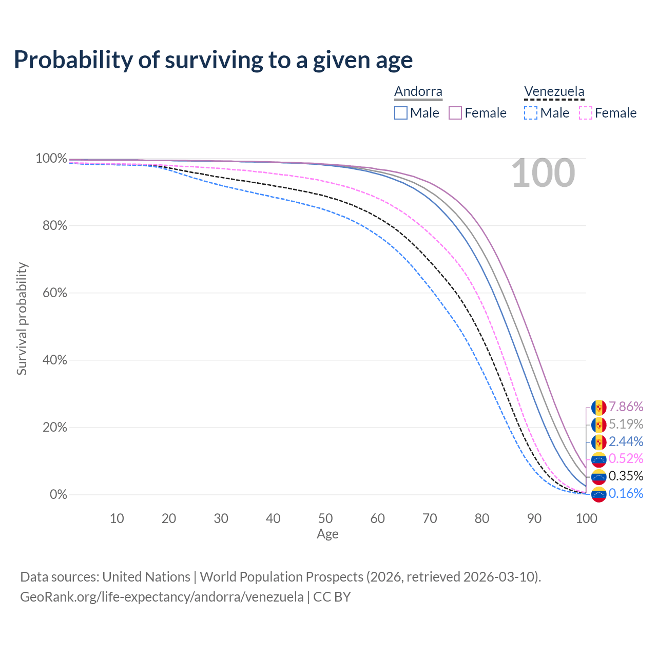 This life expectancy calculator shows the odds of living to 100, 95, 90, and below based on current age for both males and females in Andorra and Venezuela, along with mean and median age of death. The calculations are based on the 2026 life tables (actuarial tables) from the UN World Population Prospects.