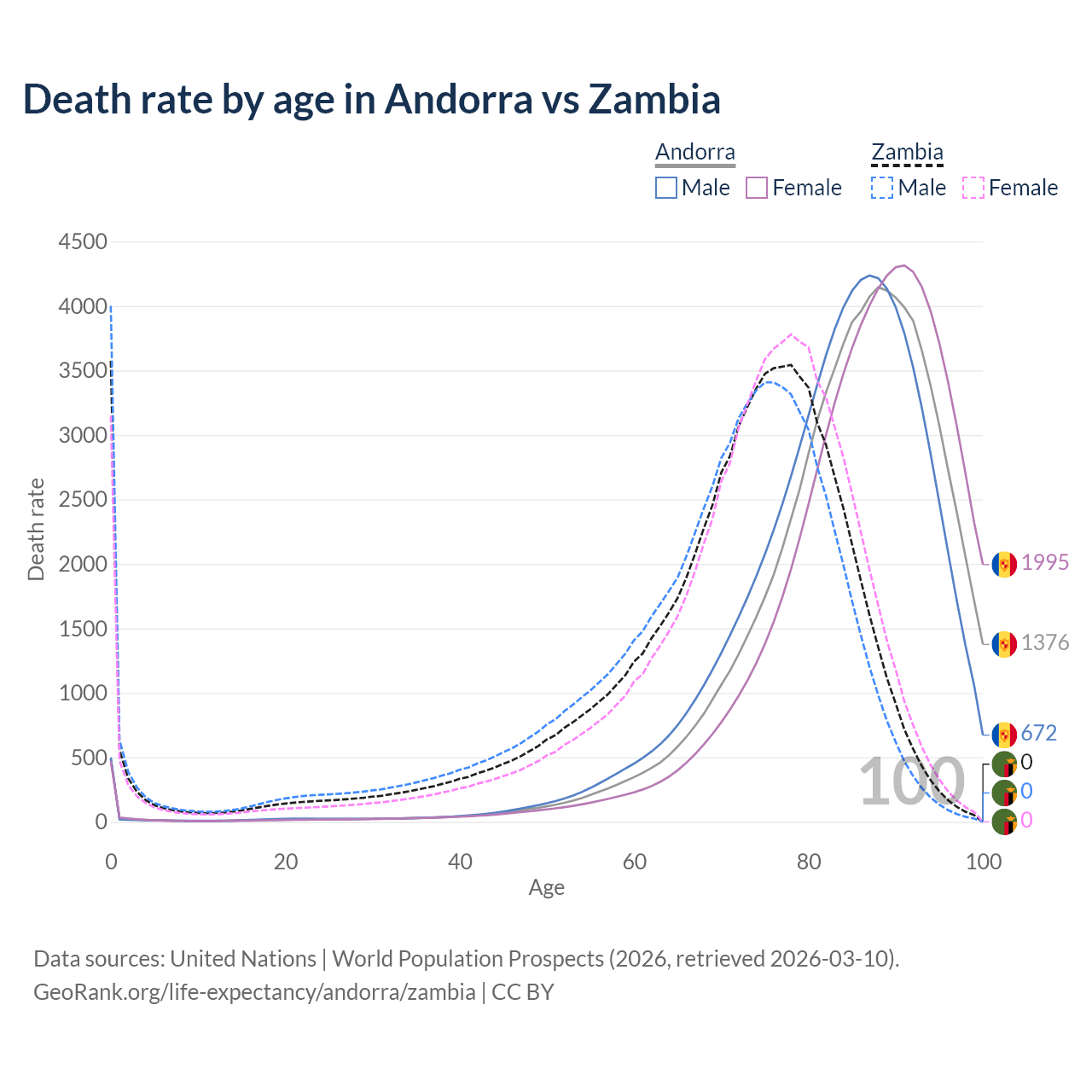 This life expectancy calculator shows the odds of living to 100, 95, 90, and below based on current age for both males and females in Andorra and Zambia, along with mean and median age of death. The calculations are based on the 2026 life tables (actuarial tables) from the UN World Population Prospects.