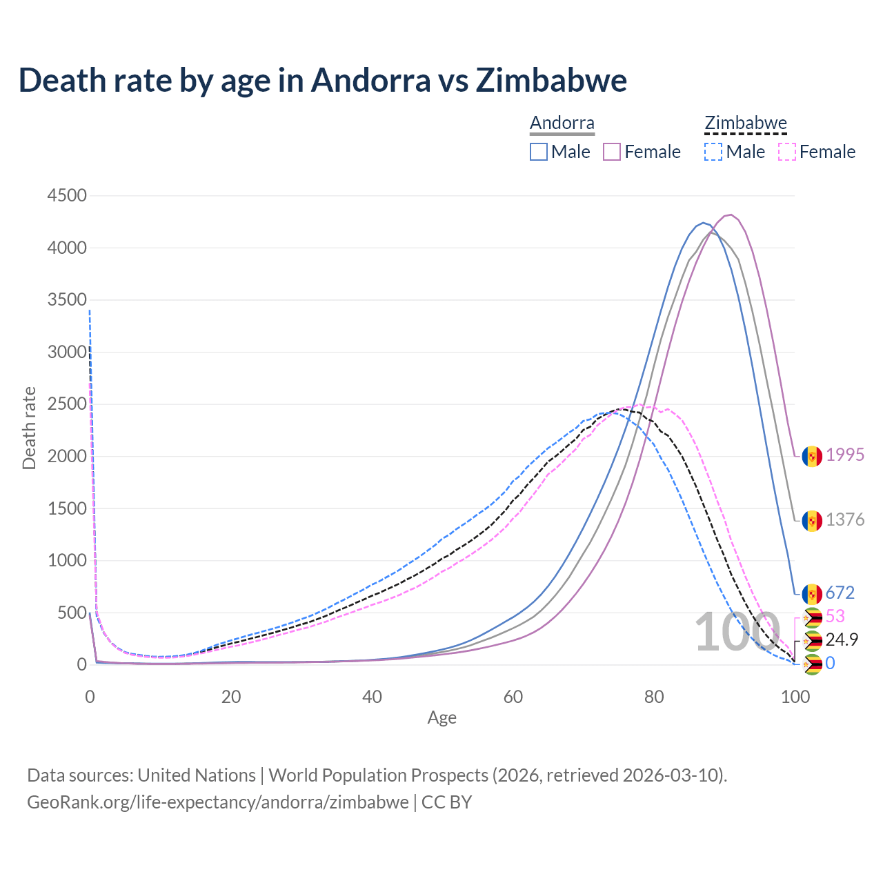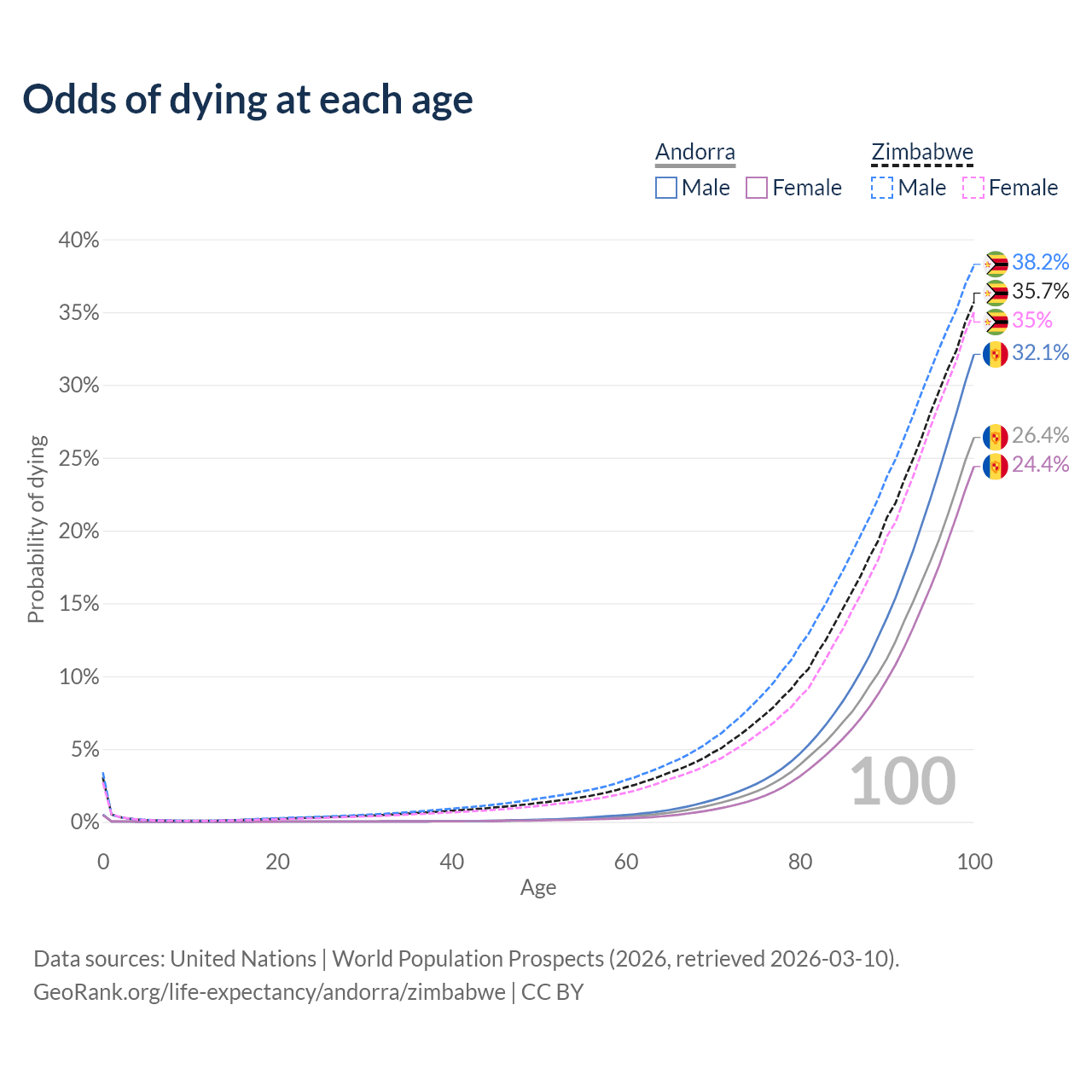 This life expectancy calculator shows the odds of living to 100, 95, 90, and below based on current age for both males and females in Andorra and Zimbabwe, along with mean and median age of death. The calculations are based on the 2026 life tables (actuarial tables) from the UN World Population Prospects.