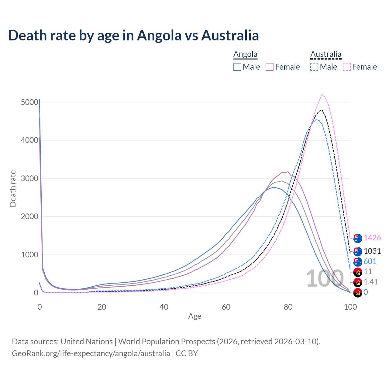 In Angola, the most common age of death is 0, compared to 91 in Australia. The median age of death is 71.9 in Angola and 87.5 in Australia, meaning only half of each cohort is expected to live past that age.