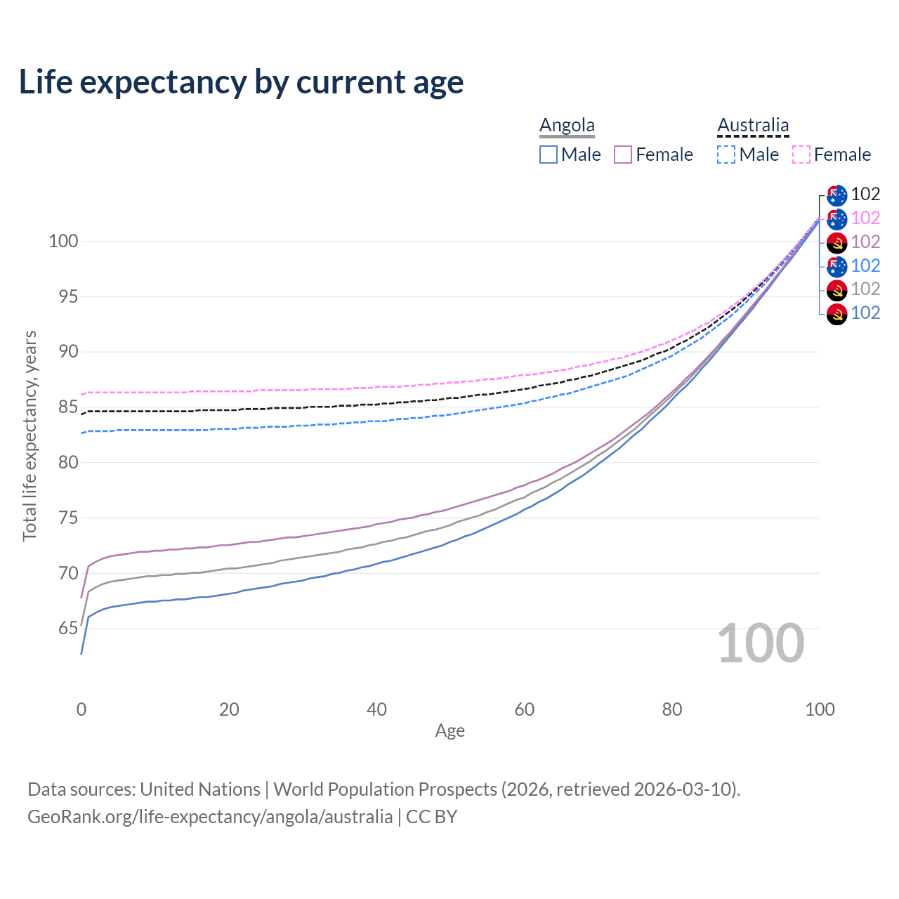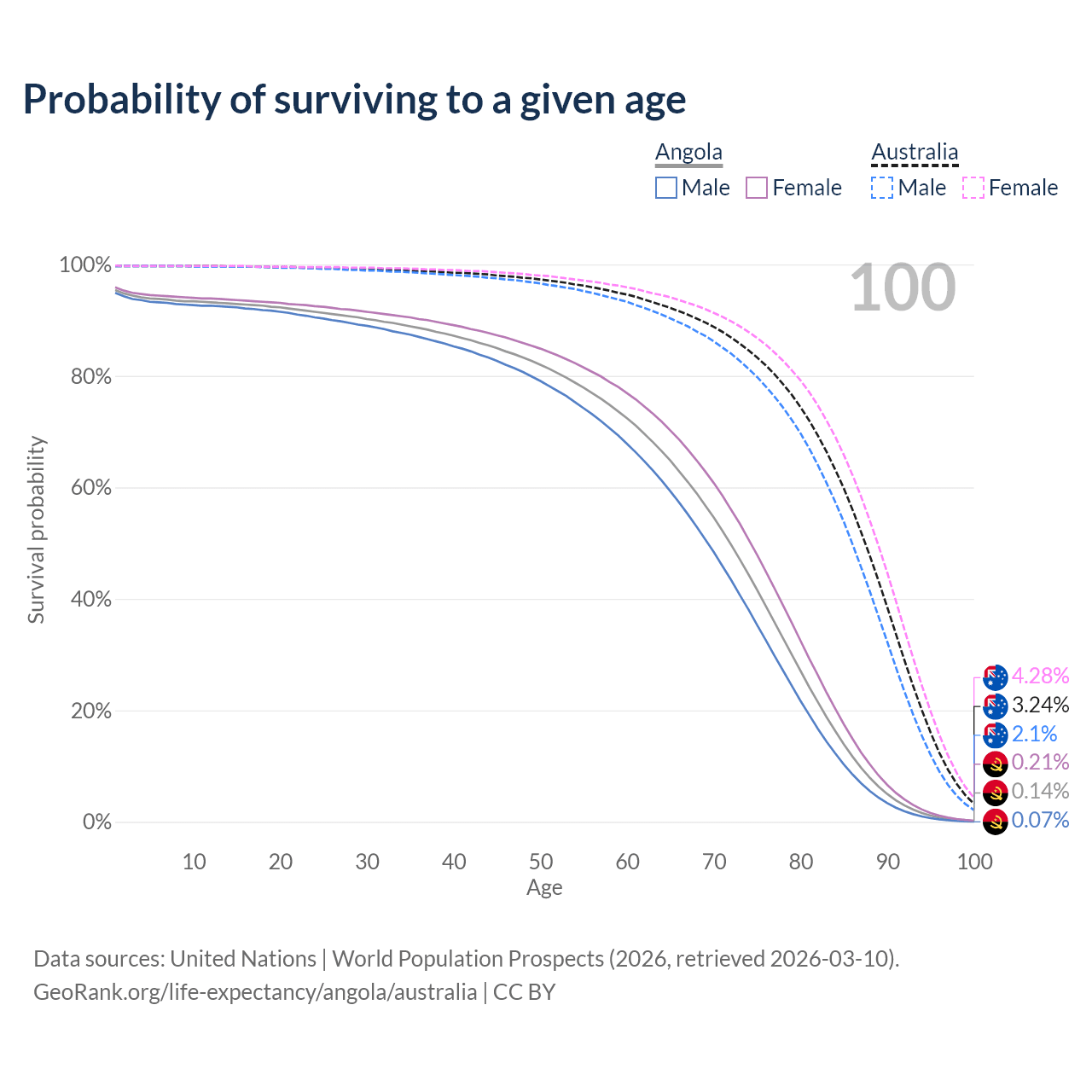 This life expectancy calculator shows the odds of living to 100, 95, 90, and below based on current age for both males and females in Angola and Australia, along with mean and median age of death. The calculations are based on the 2026 life tables (actuarial tables) from the UN World Population Prospects.