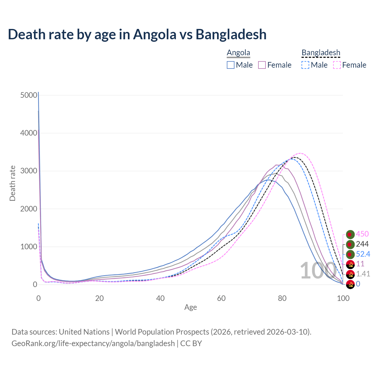 In Angola, the most common age of death is 0, compared to 84 in Bangladesh. The median age of death is 71.9 in Angola and 79.7 in Bangladesh, meaning only half of each cohort is expected to live past that age.