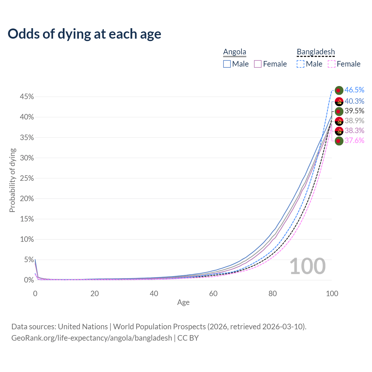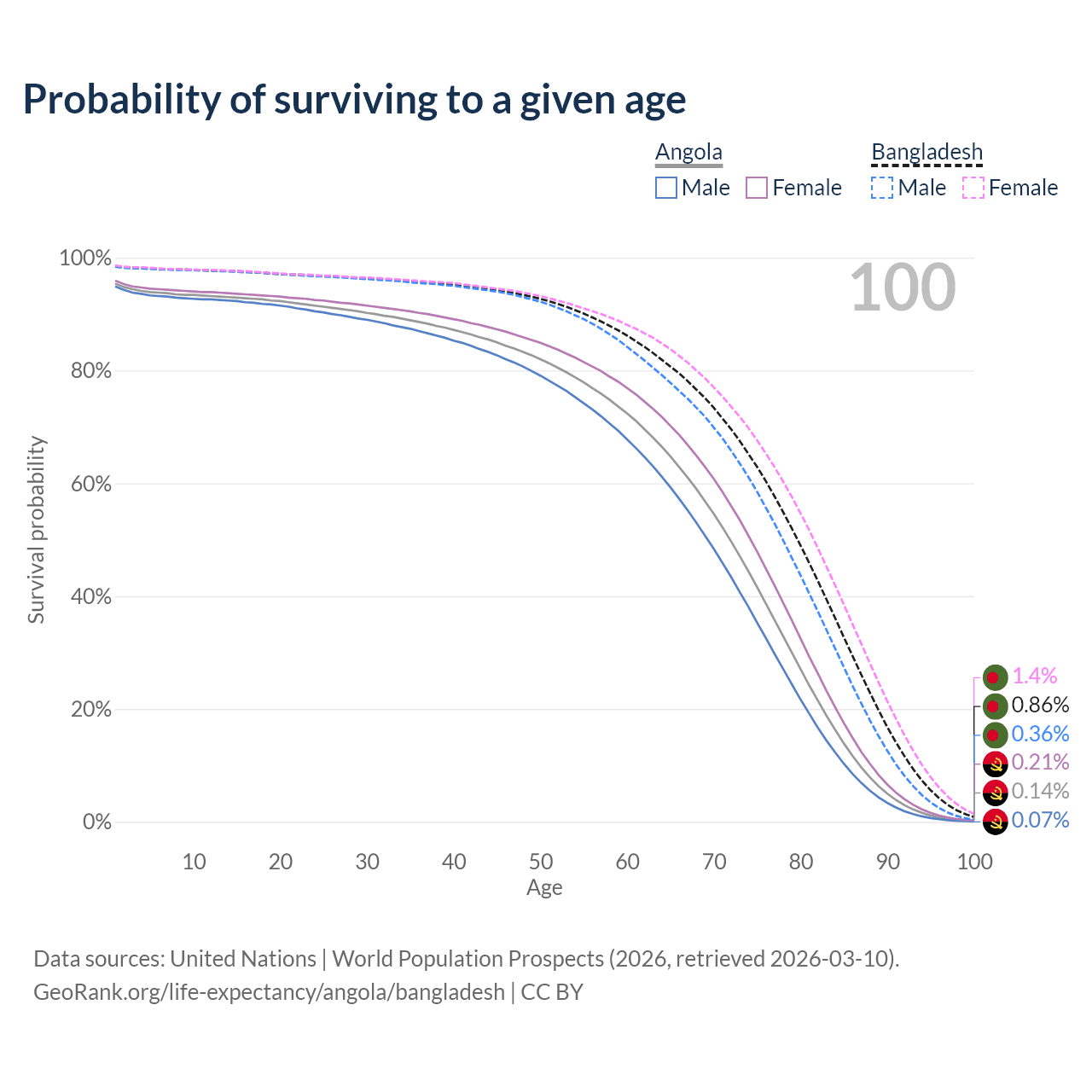 This life expectancy calculator shows the odds of living to 100, 95, 90, and below based on current age for both males and females in Angola and Bangladesh, along with mean and median age of death. The calculations are based on the 2026 life tables (actuarial tables) from the UN World Population Prospects.