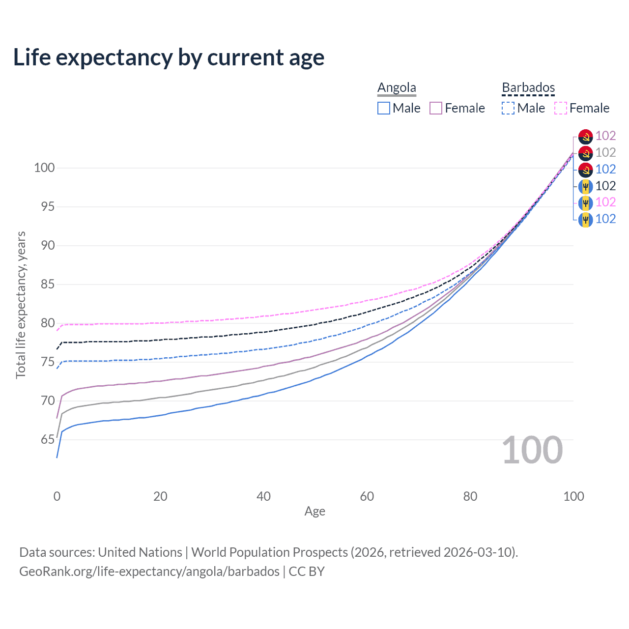 This life expectancy calculator shows the odds of living to 100, 95, 90, and below based on current age for both males and females in Angola and Barbados, along with mean and median age of death. The calculations are based on the 2026 life tables (actuarial tables) from the UN World Population Prospects.