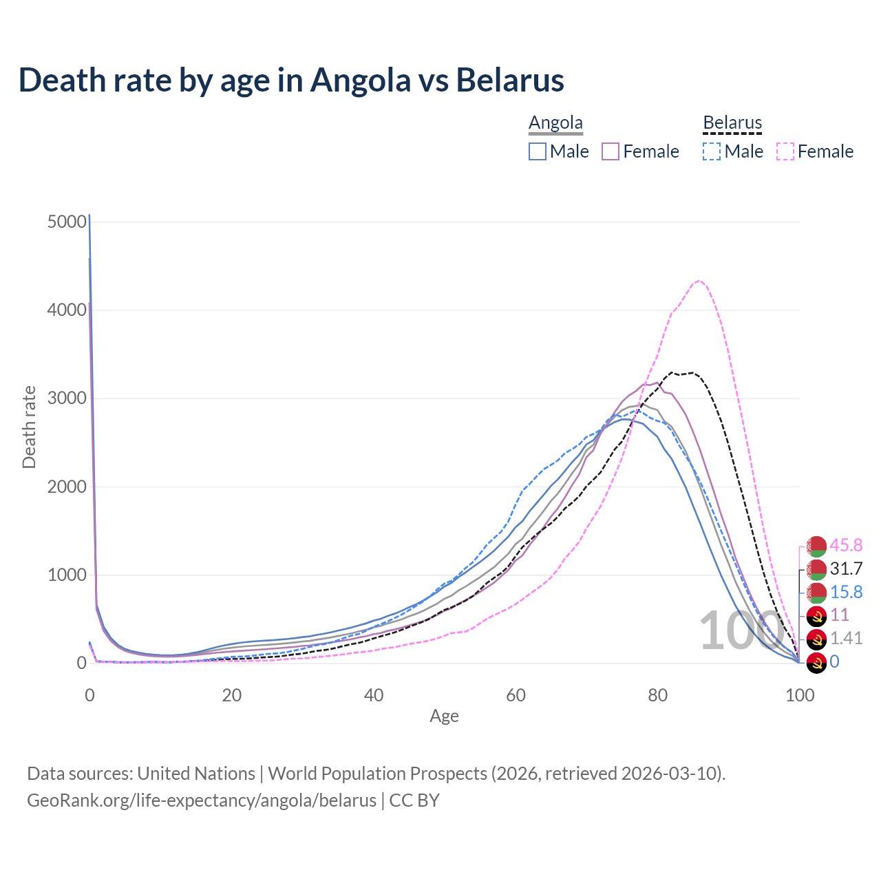 In Angola, the most common age of death is 0, compared to 82 in Belarus. The median age of death is 71.9 in Angola and 78.1 in Belarus, meaning only half of each cohort is expected to live past that age.