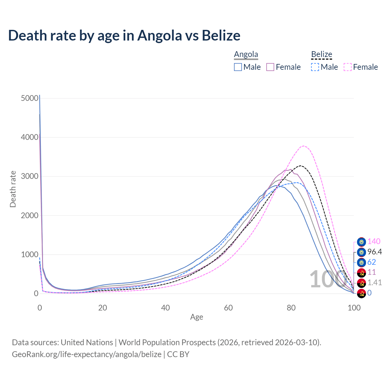 In Angola, the most common age of death is 0, compared to 83 in Belize. The median age of death is 71.9 in Angola and 77.5 in Belize, meaning only half of each cohort is expected to live past that age.