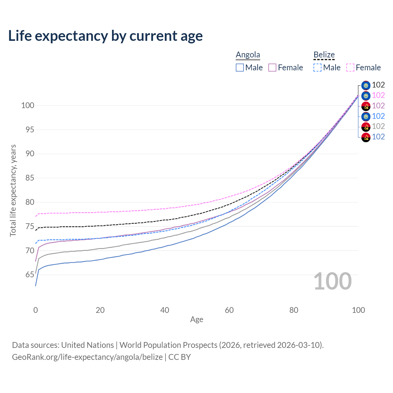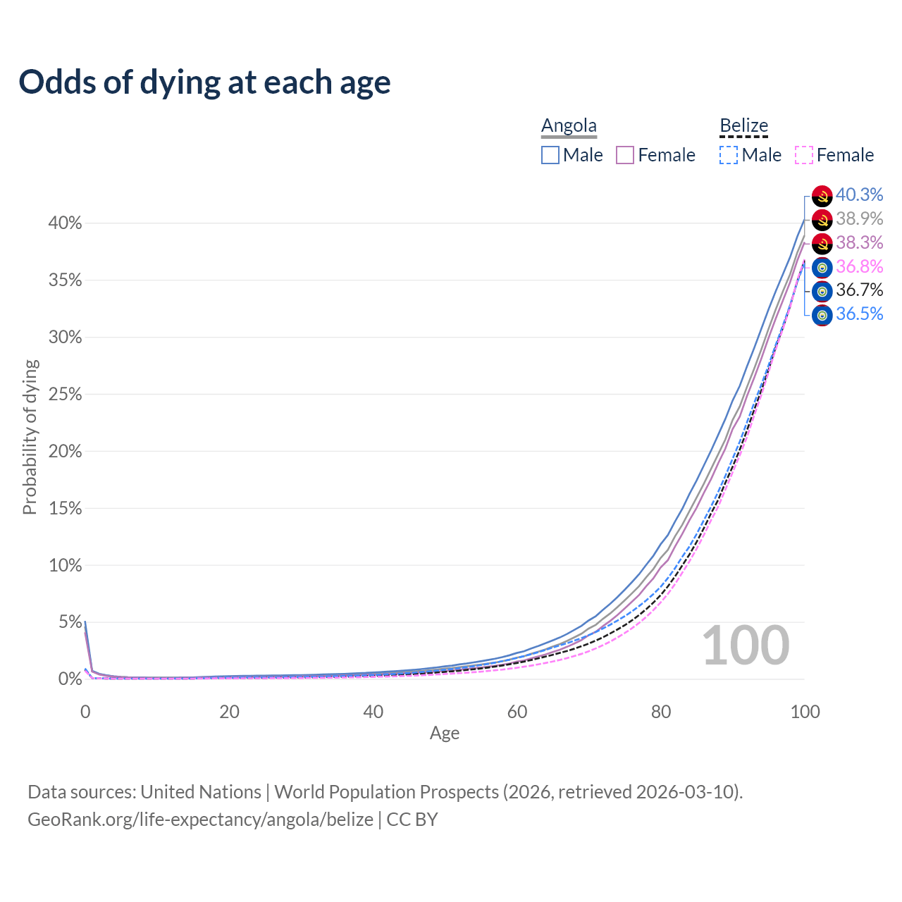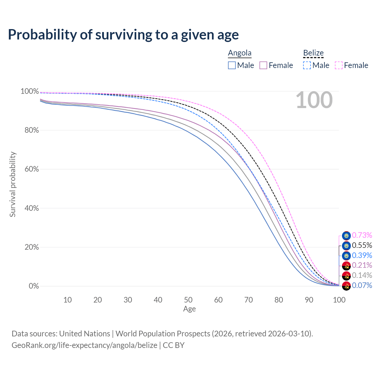 This life expectancy calculator shows the odds of living to 100, 95, 90, and below based on current age for both males and females in Angola and Belize, along with mean and median age of death. The calculations are based on the 2026 life tables (actuarial tables) from the UN World Population Prospects.