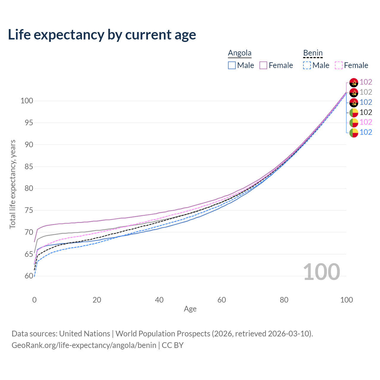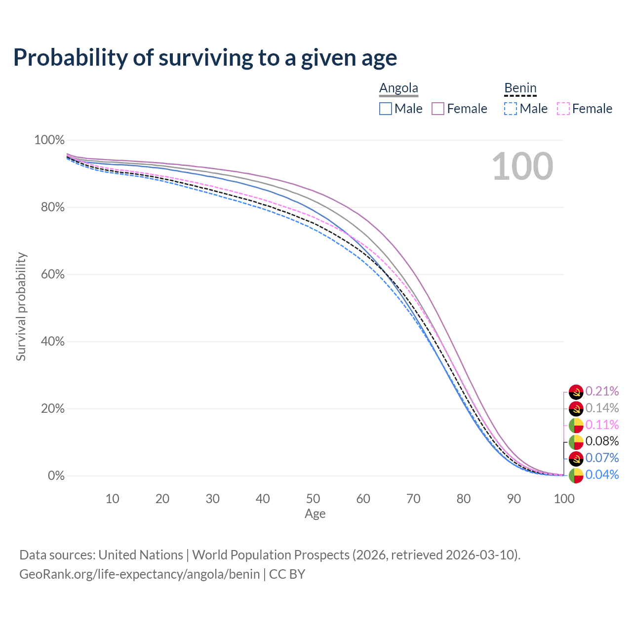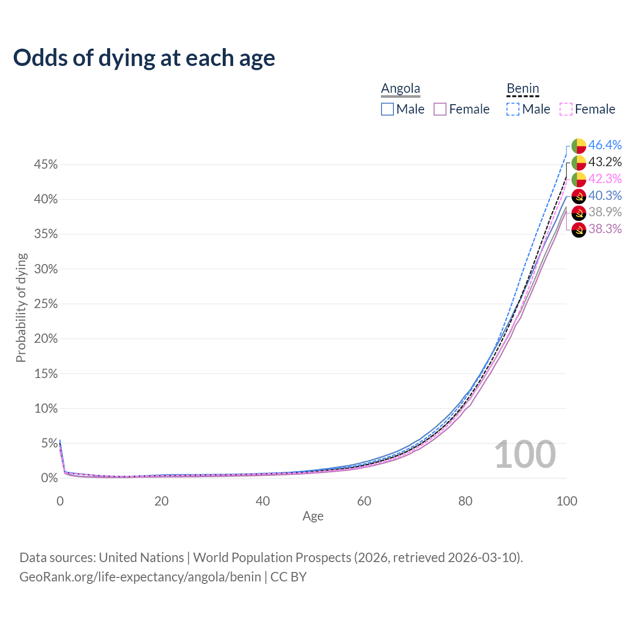 This life expectancy calculator shows the odds of living to 100, 95, 90, and below based on current age for both males and females in Angola and Benin, along with mean and median age of death. The calculations are based on the 2026 life tables (actuarial tables) from the UN World Population Prospects.