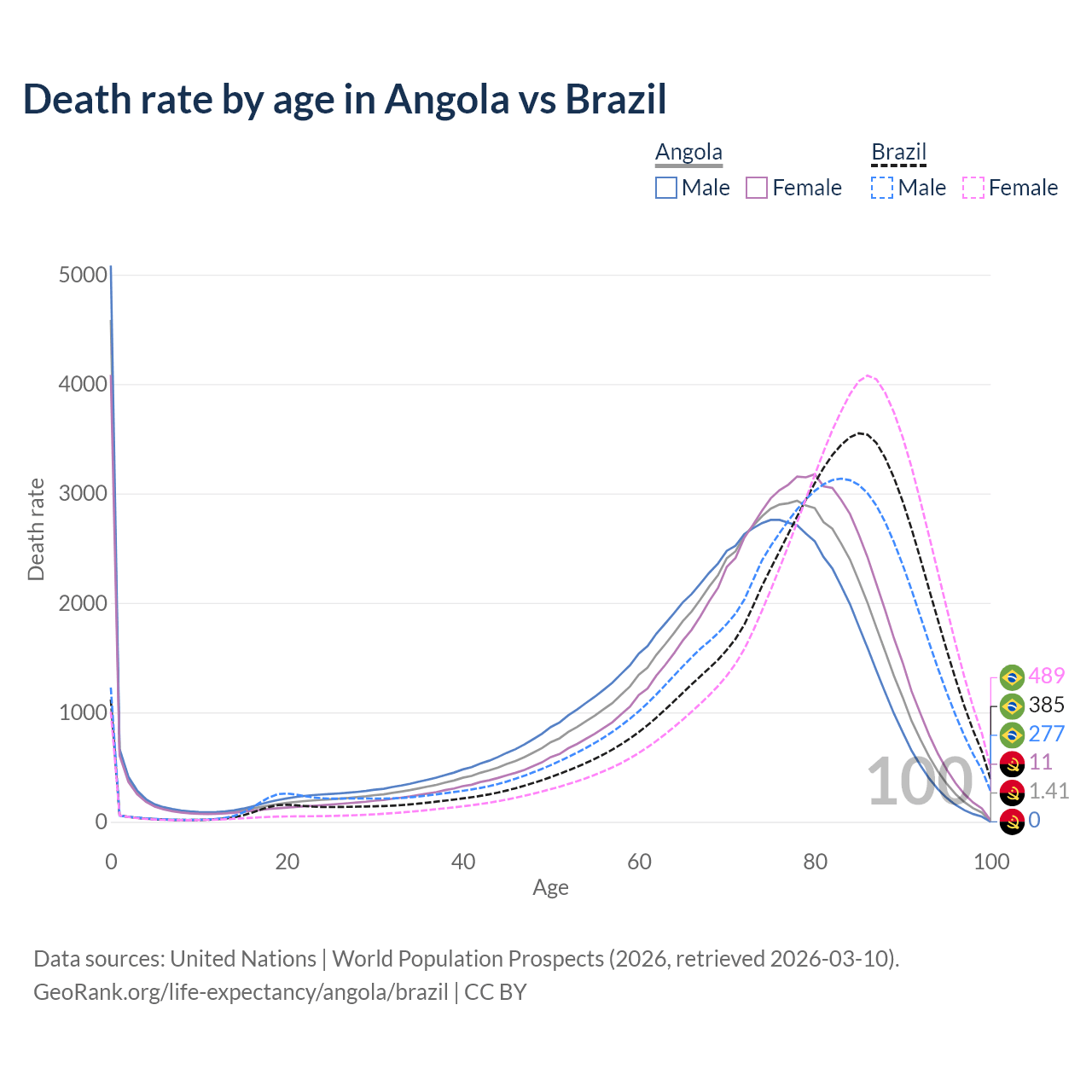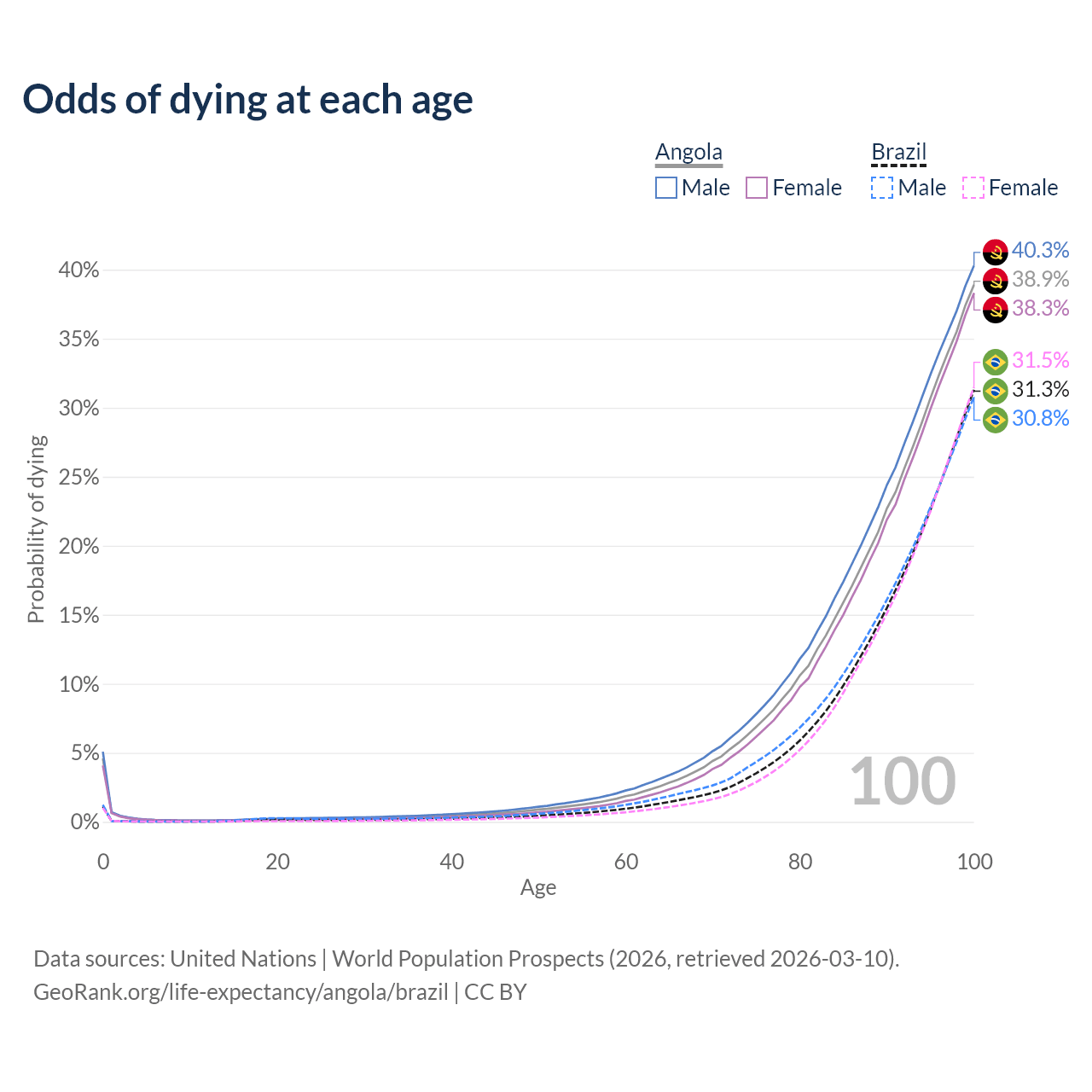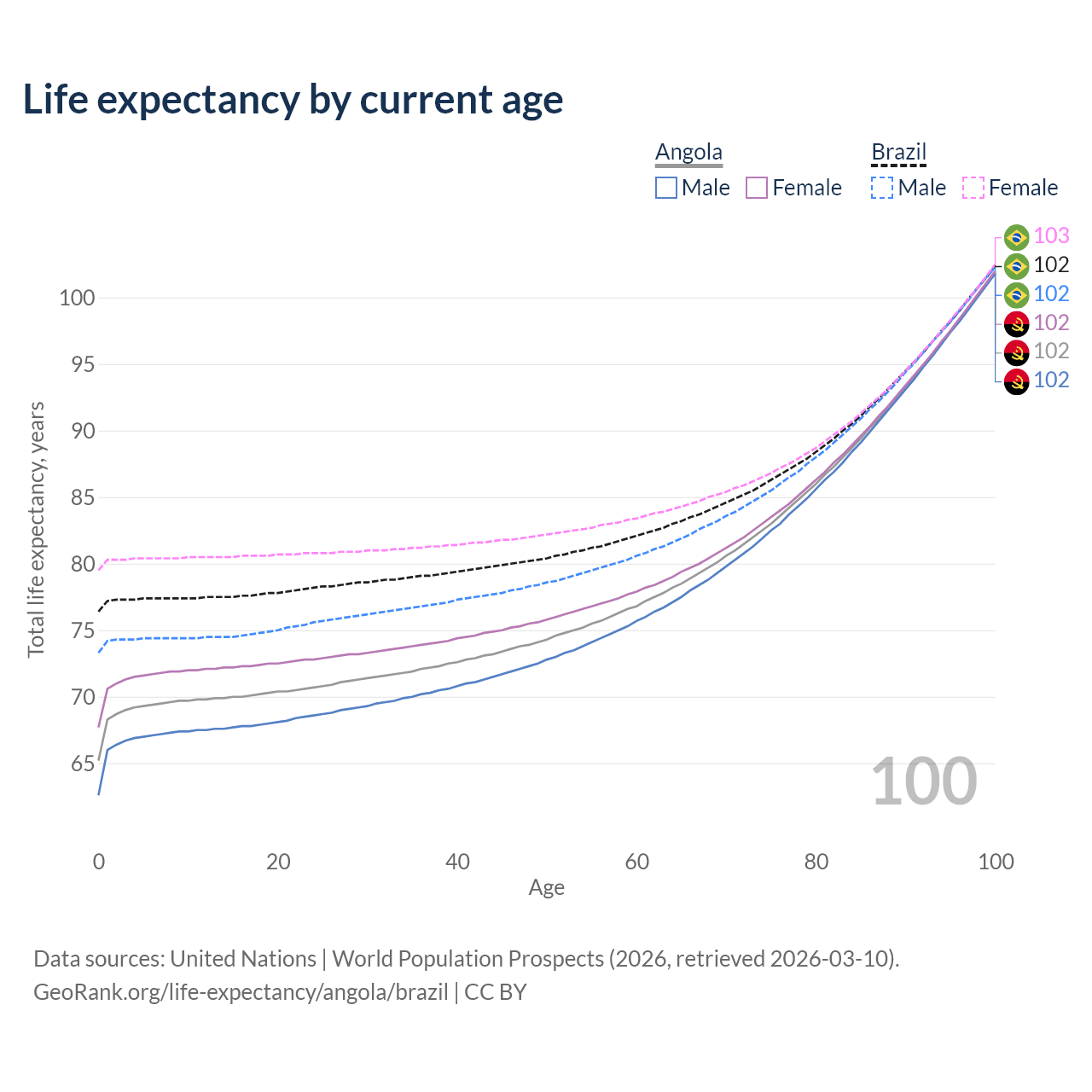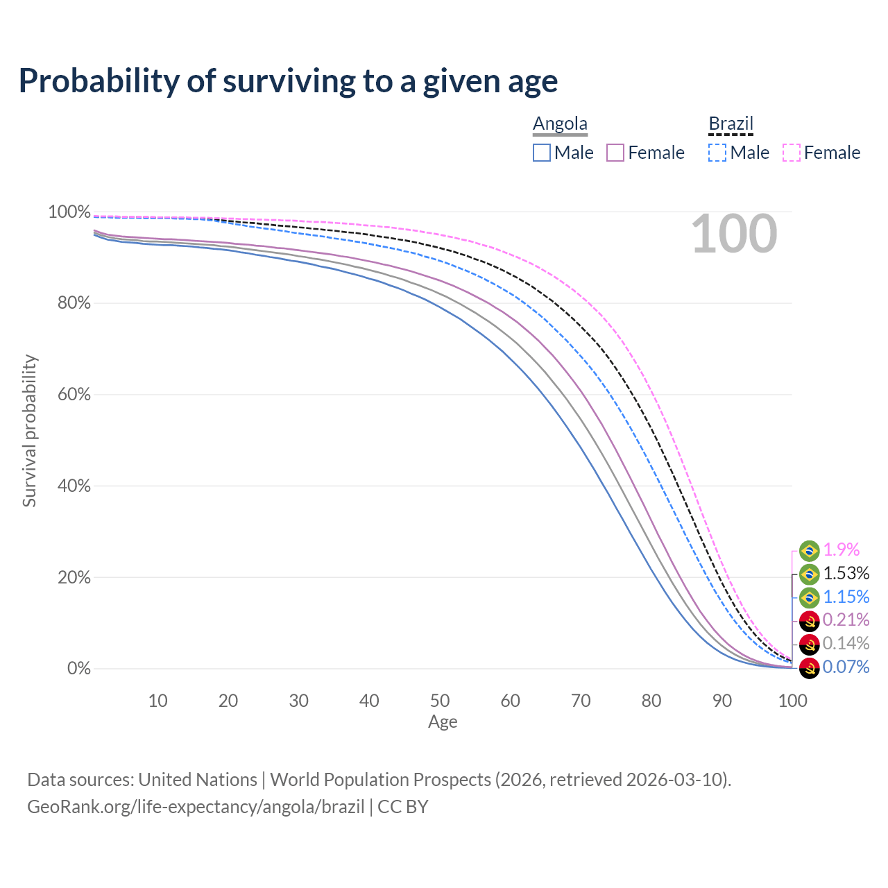 This life expectancy calculator shows the odds of living to 100, 95, 90, and below based on current age for both males and females in Angola and Brazil, along with mean and median age of death. The calculations are based on the 2026 life tables (actuarial tables) from the UN World Population Prospects.