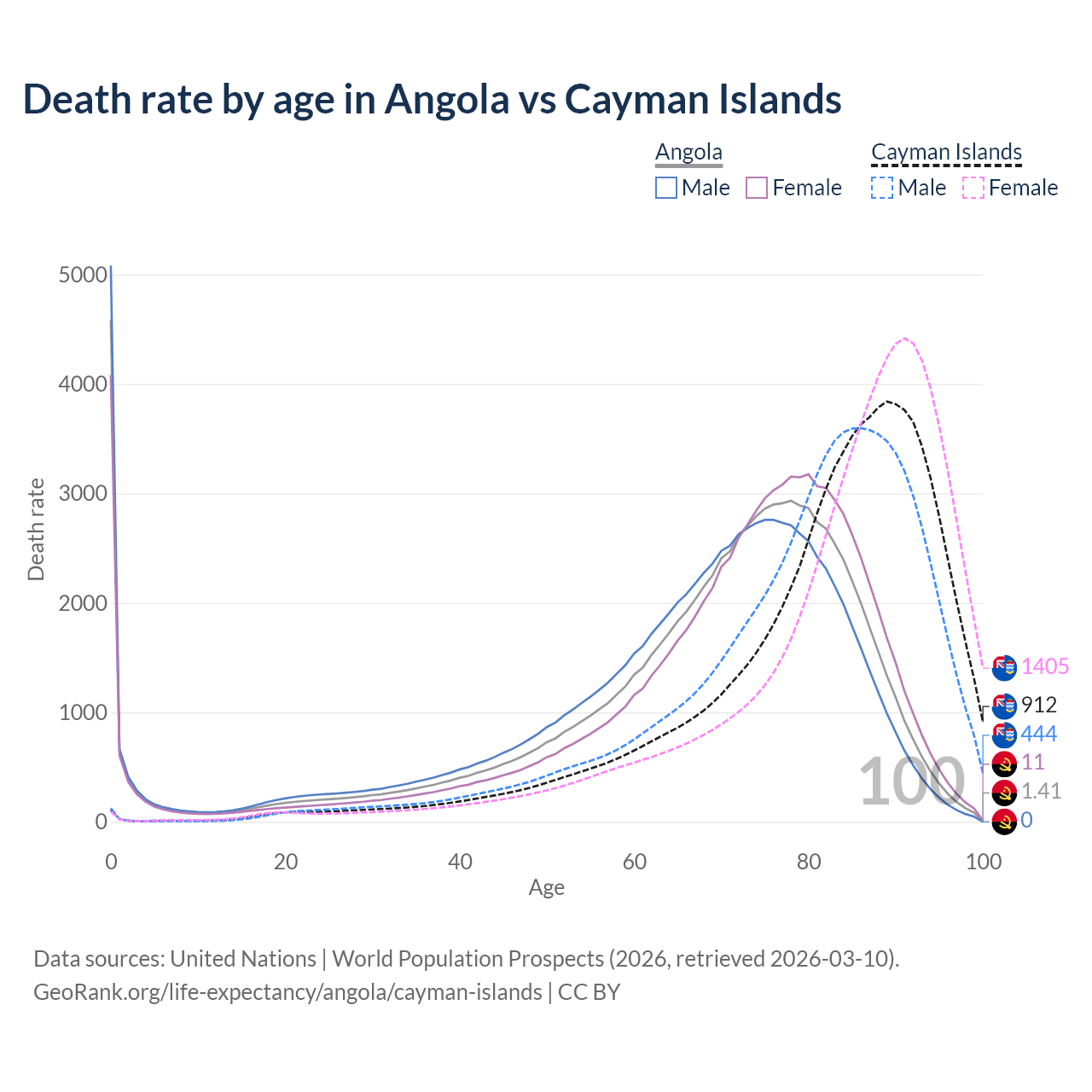 In Angola, the most common age of death is 0, compared to 89 in the Cayman Islands. The median age of death is 71.9 in Angola and 84.9 in the Cayman Islands, meaning only half of each cohort is expected to live past that age.