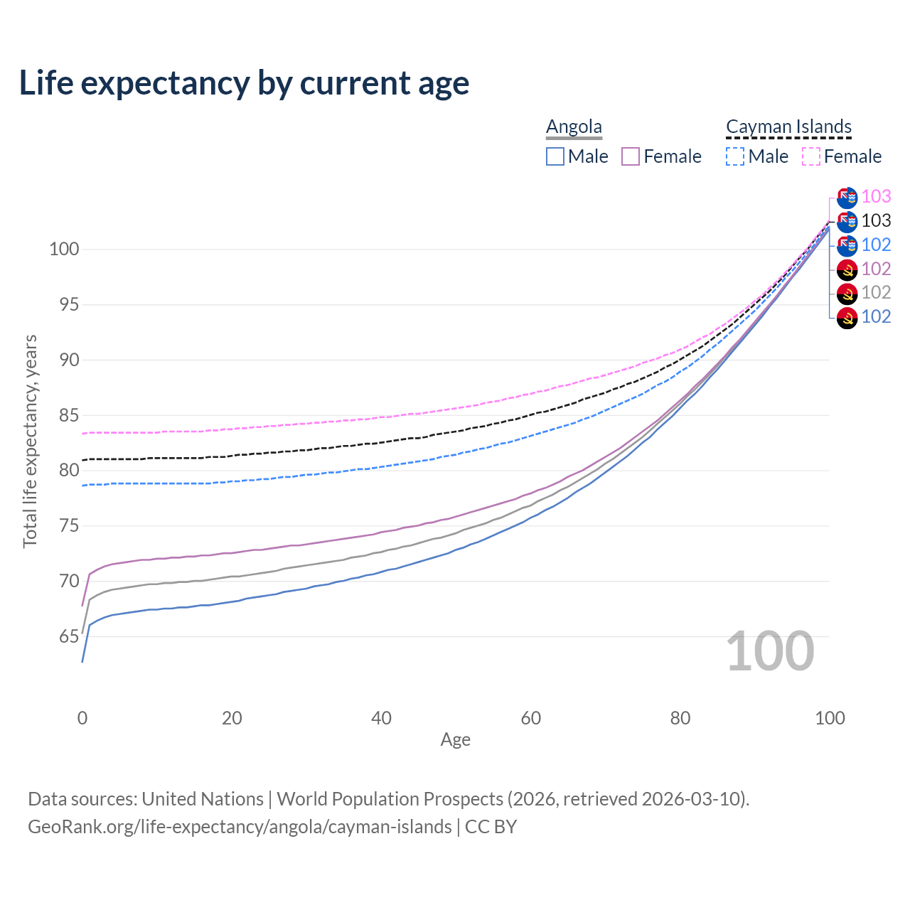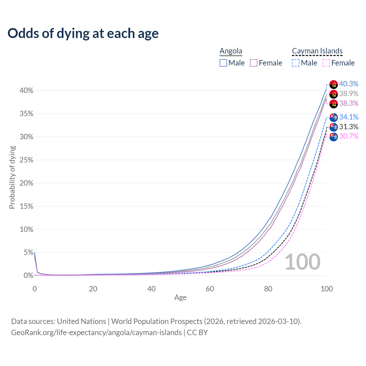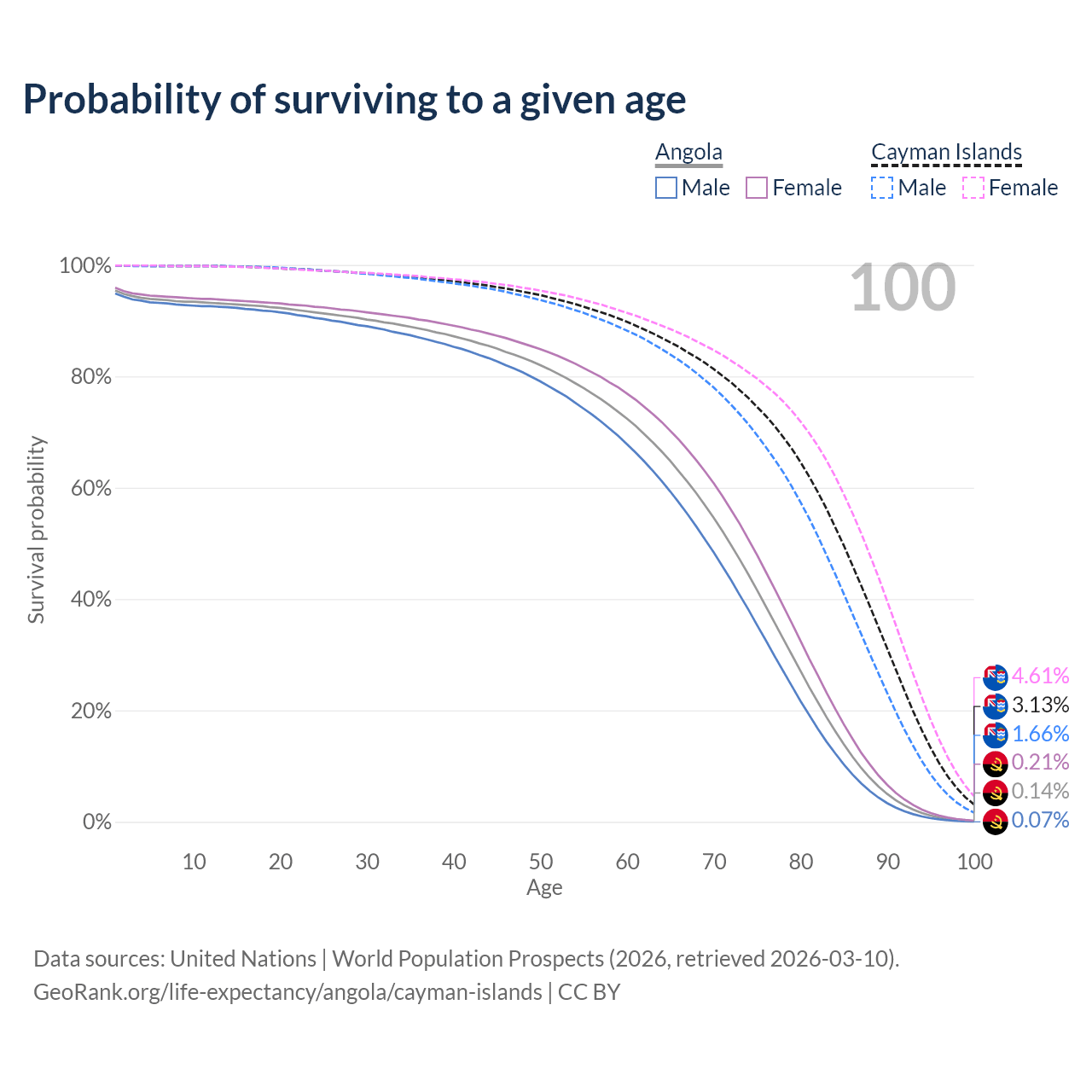 This life expectancy calculator shows the odds of living to 100, 95, 90, and below based on current age for both males and females in Angola and the Cayman Islands, along with mean and median age of death. The calculations are based on the 2026 life tables (actuarial tables) from the UN World Population Prospects.