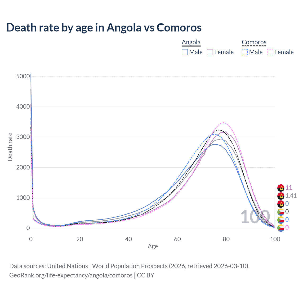 This life expectancy calculator shows the odds of living to 100, 95, 90, and below based on current age for both males and females in Angola and Comoros, along with mean and median age of death. The calculations are based on the 2026 life tables (actuarial tables) from the UN World Population Prospects.