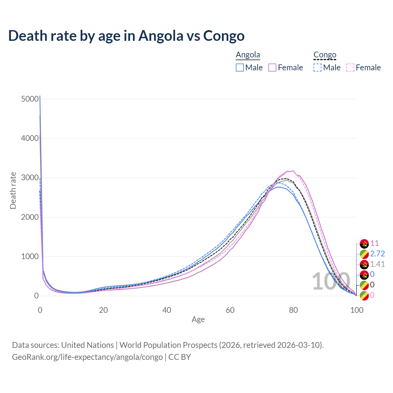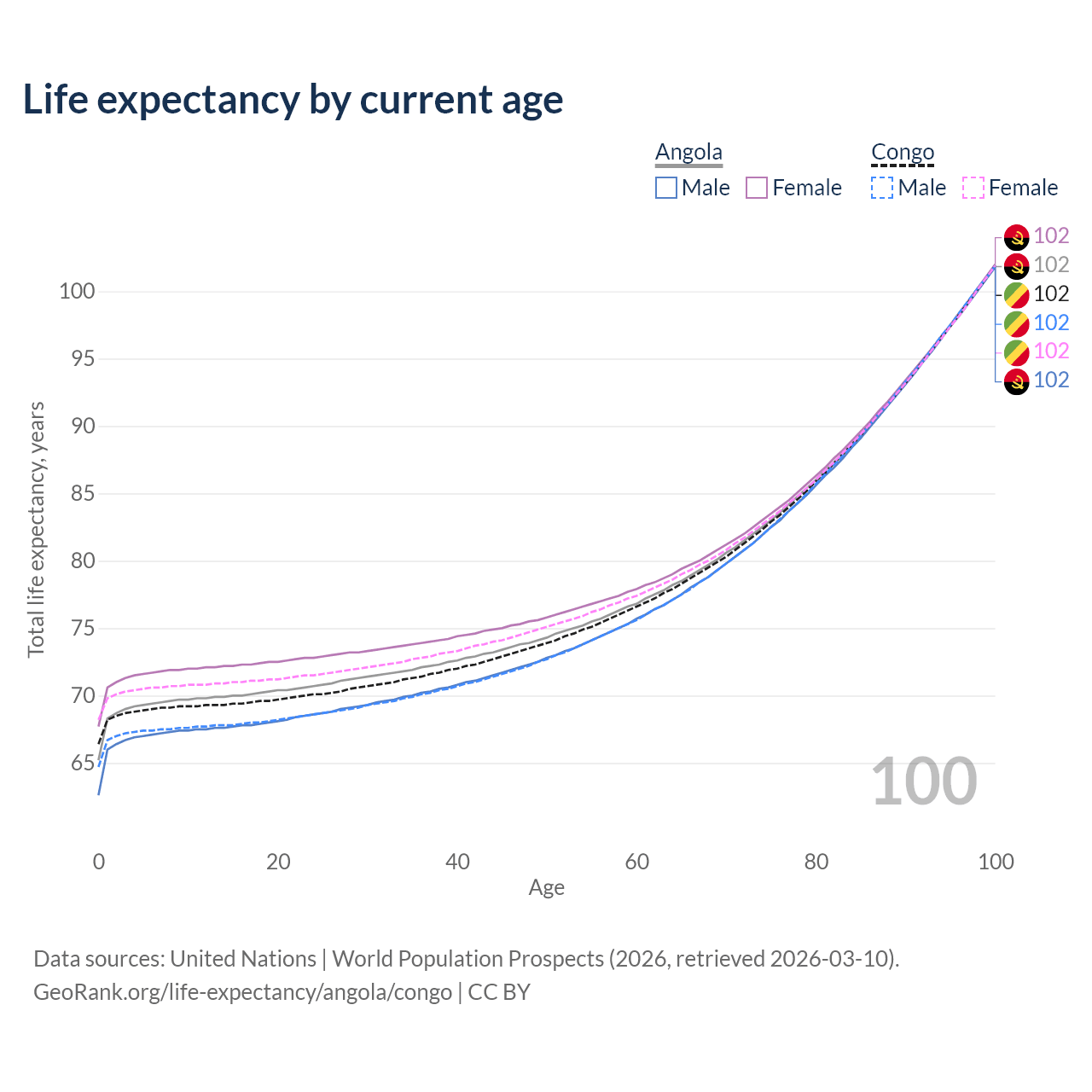 This life expectancy calculator shows the odds of living to 100, 95, 90, and below based on current age for both males and females in Angola and the Congo, along with mean and median age of death. The calculations are based on the 2026 life tables (actuarial tables) from the UN World Population Prospects.