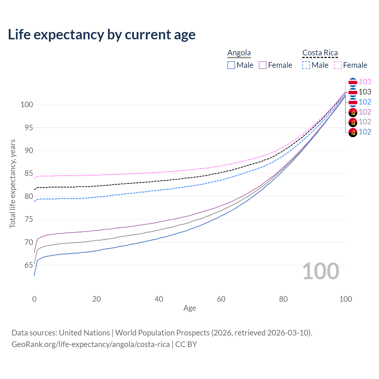 This life expectancy calculator shows the odds of living to 100, 95, 90, and below based on current age for both males and females in Angola and Costa Rica, along with mean and median age of death. The calculations are based on the 2026 life tables (actuarial tables) from the UN World Population Prospects.