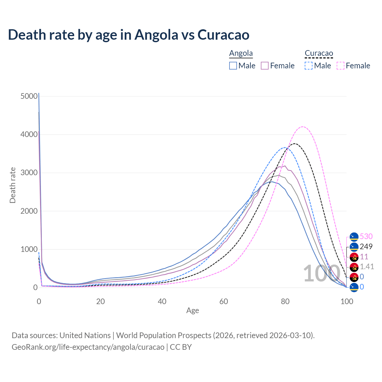 In Angola, the most common age of death is 0, compared to 83 in Curacao. The median age of death is 71.9 in Angola and 80.4 in Curacao, meaning only half of each cohort is expected to live past that age.