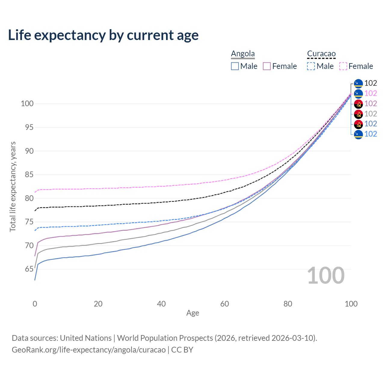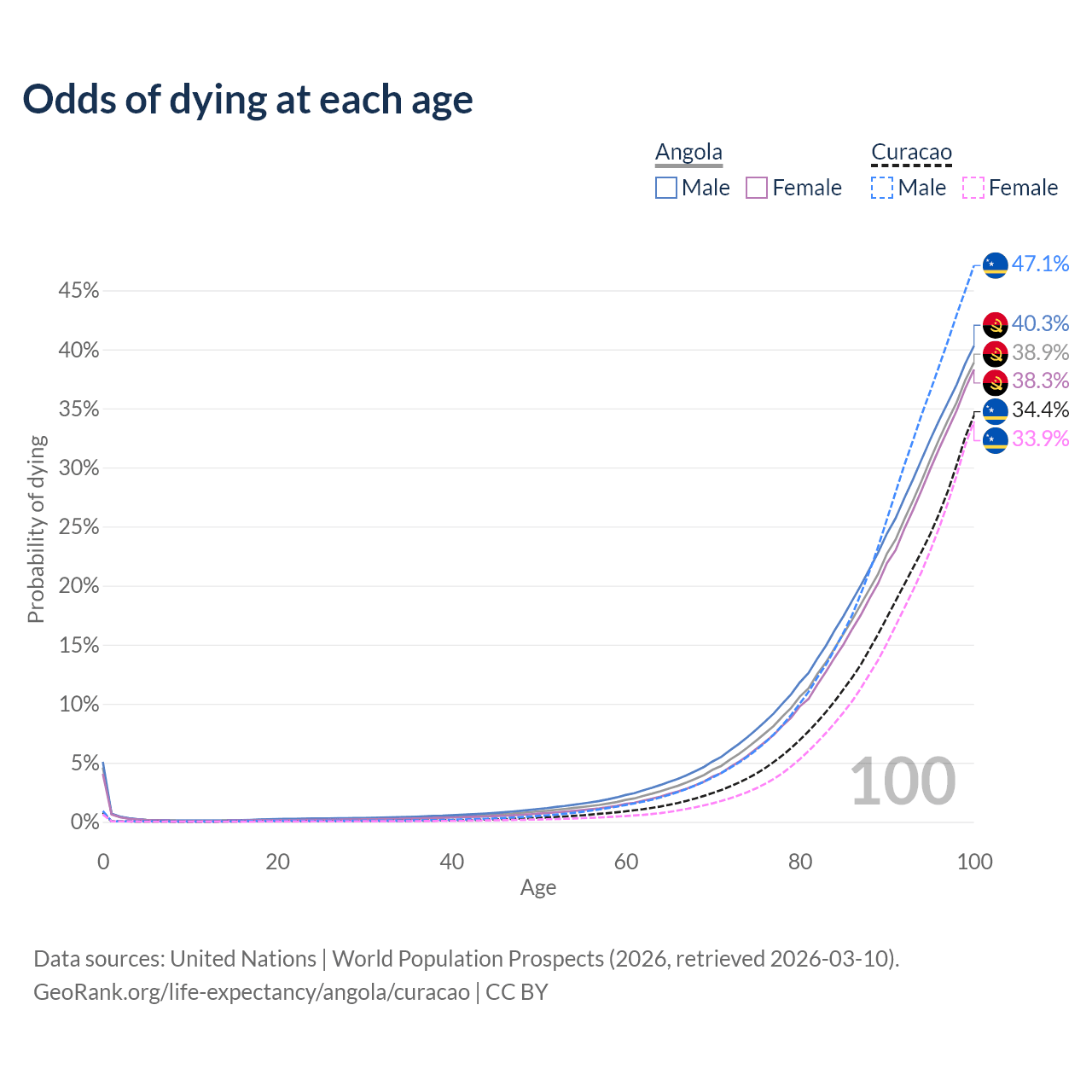 This life expectancy calculator shows the odds of living to 100, 95, 90, and below based on current age for both males and females in Angola and Curacao, along with mean and median age of death. The calculations are based on the 2026 life tables (actuarial tables) from the UN World Population Prospects.