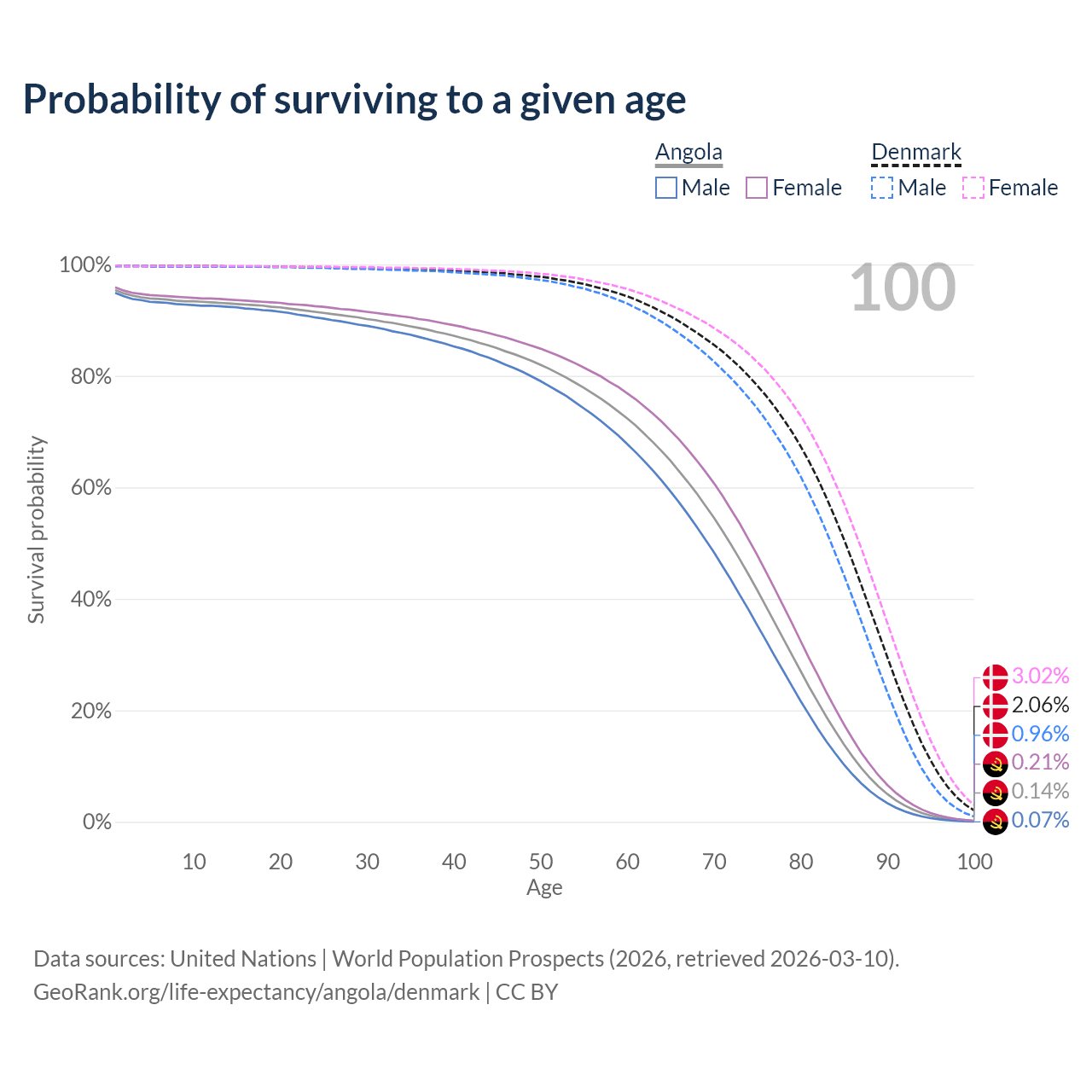 This life expectancy calculator shows the odds of living to 100, 95, 90, and below based on current age for both males and females in Angola and Denmark, along with mean and median age of death. The calculations are based on the 2026 life tables (actuarial tables) from the UN World Population Prospects.