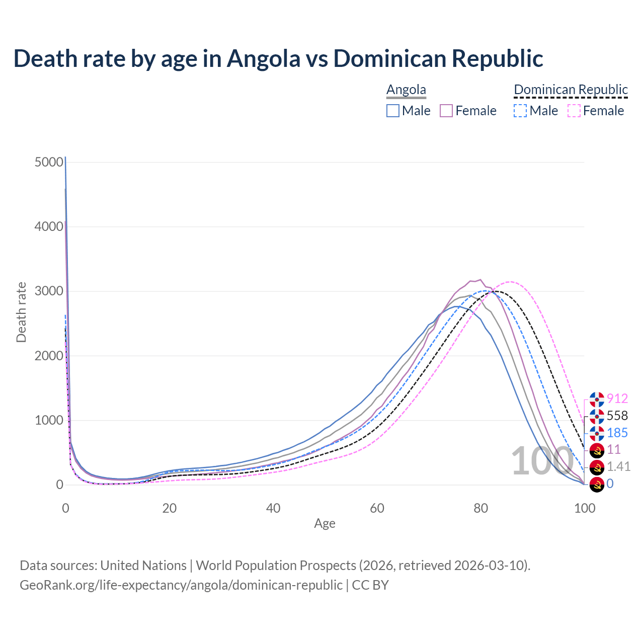 In Angola, the most common age of death is 0, compared to 83 in the Dominican Republic. The median age of death is 71.9 in Angola and 78.9 in the Dominican Republic, meaning only half of each cohort is expected to live past that age.