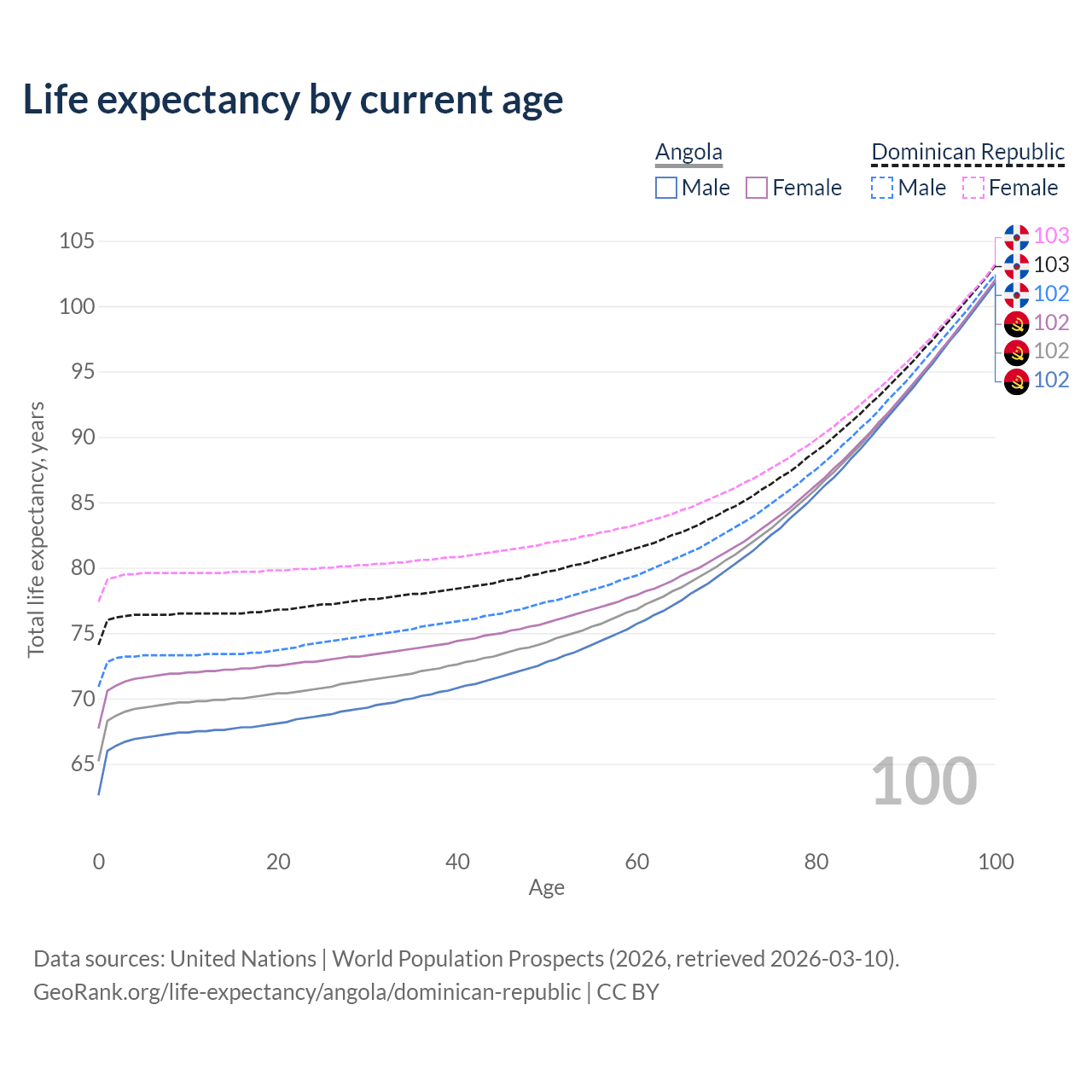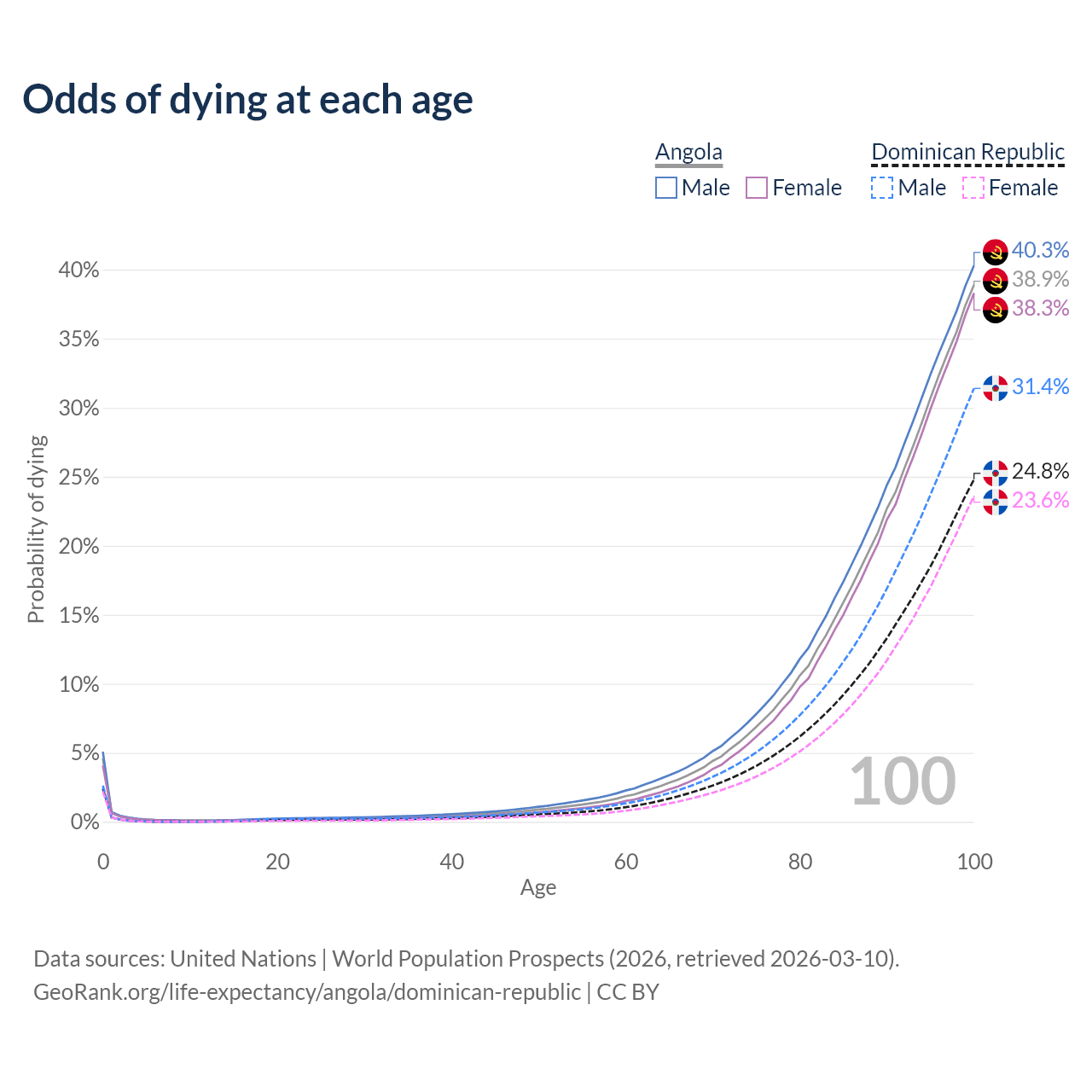 This life expectancy calculator shows the odds of living to 100, 95, 90, and below based on current age for both males and females in Angola and the Dominican Republic, along with mean and median age of death. The calculations are based on the 2026 life tables (actuarial tables) from the UN World Population Prospects.