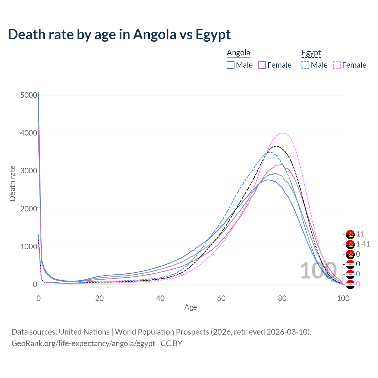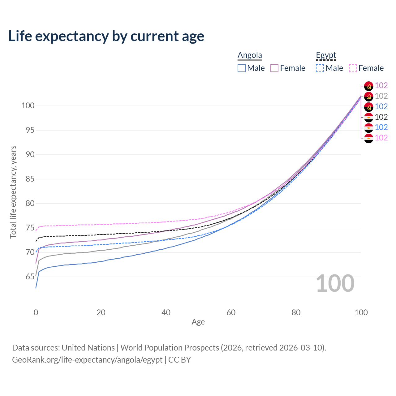 This life expectancy calculator shows the odds of living to 100, 95, 90, and below based on current age for both males and females in Angola and Egypt, along with mean and median age of death. The calculations are based on the 2026 life tables (actuarial tables) from the UN World Population Prospects.