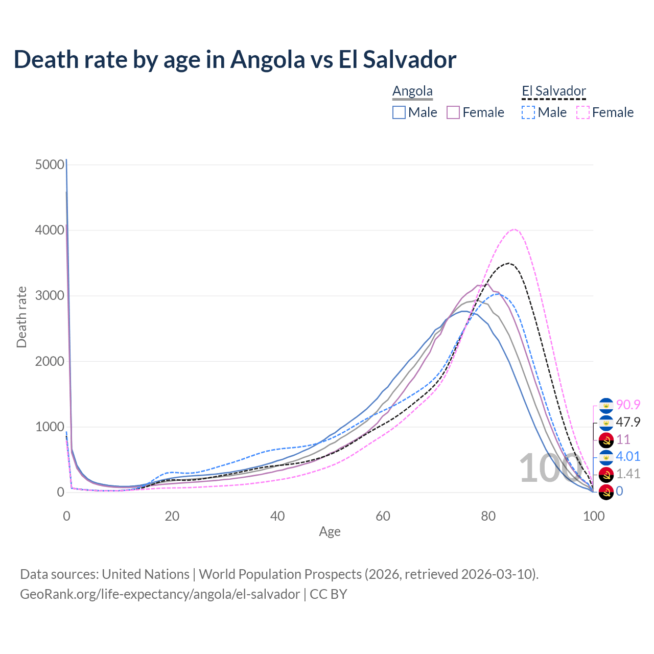 In Angola, the most common age of death is 0, compared to 84 in El Salvador. The median age of death is 71.9 in Angola and 78.1 in El Salvador, meaning only half of each cohort is expected to live past that age.
