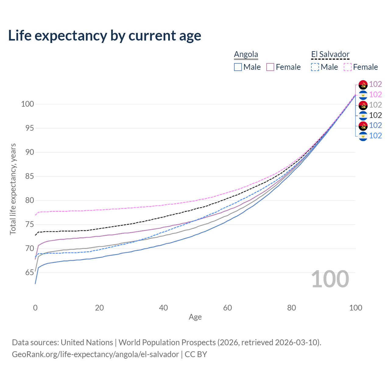 This life expectancy calculator shows the odds of living to 100, 95, 90, and below based on current age for both males and females in Angola and El Salvador, along with mean and median age of death. The calculations are based on the 2026 life tables (actuarial tables) from the UN World Population Prospects.