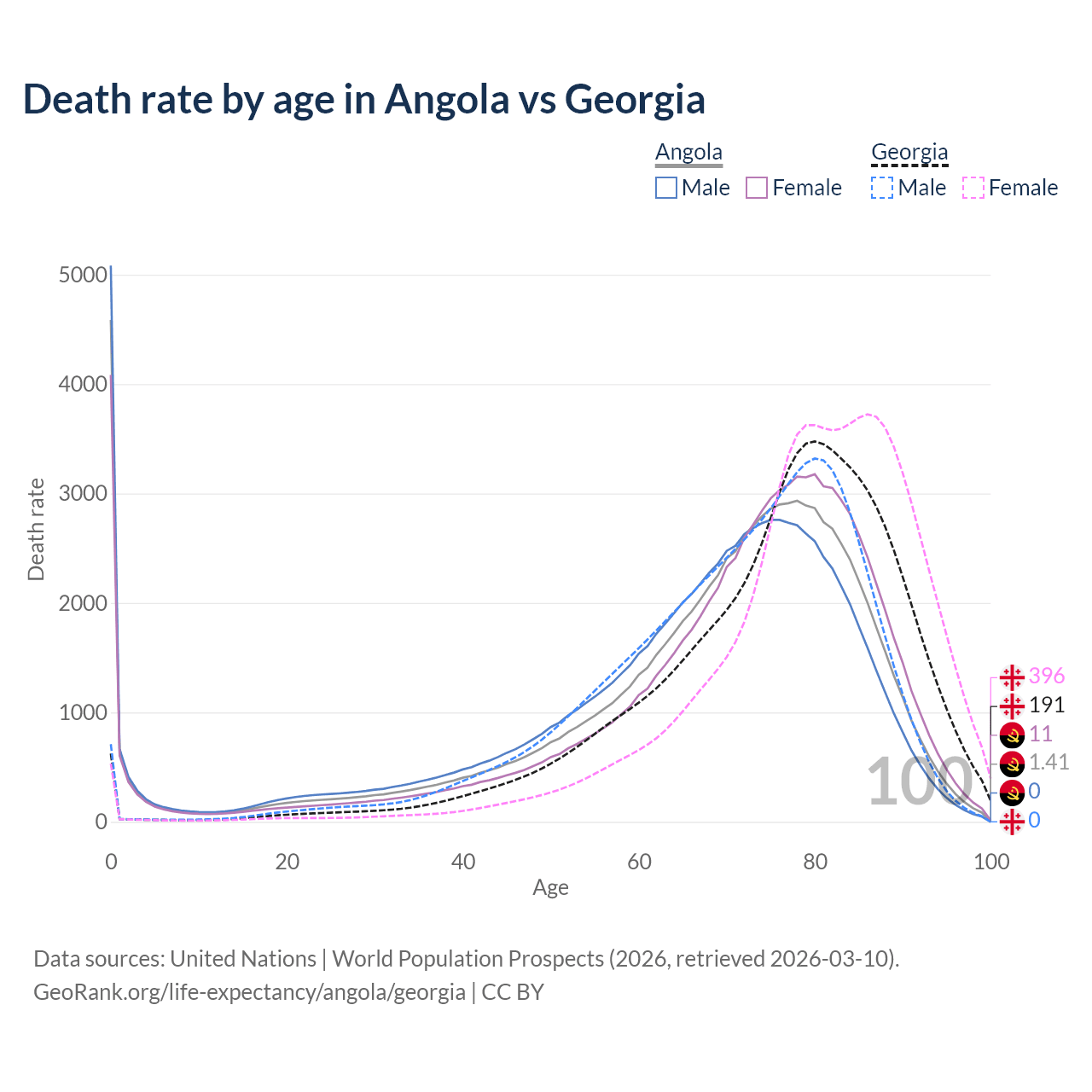 In Angola, the most common age of death is 0, compared to 80 in Georgia. The median age of death is 71.9 in Angola and 78.2 in Georgia, meaning only half of each cohort is expected to live past that age.
