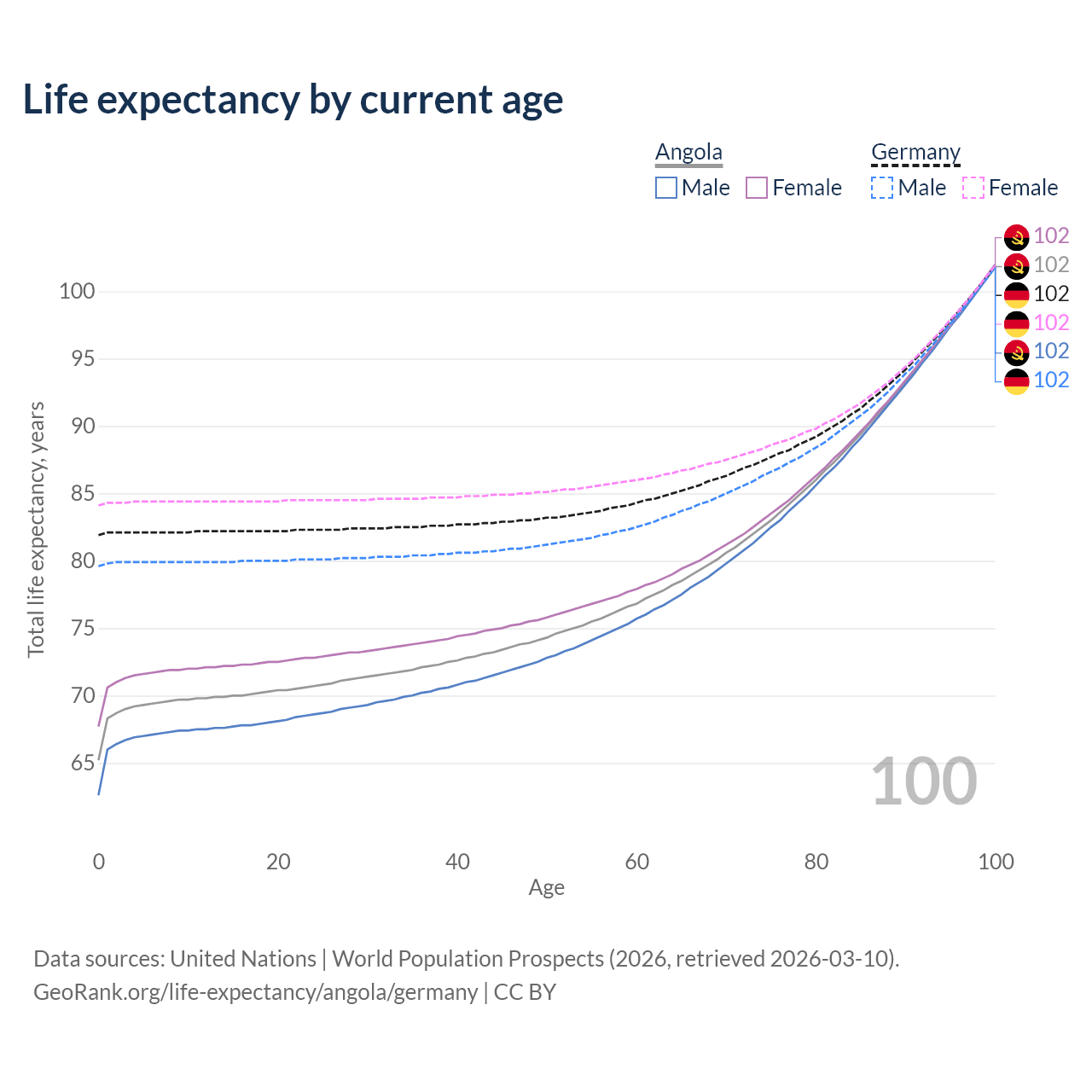 This life expectancy calculator shows the odds of living to 100, 95, 90, and below based on current age for both males and females in Angola and Germany, along with mean and median age of death. The calculations are based on the 2026 life tables (actuarial tables) from the UN World Population Prospects.