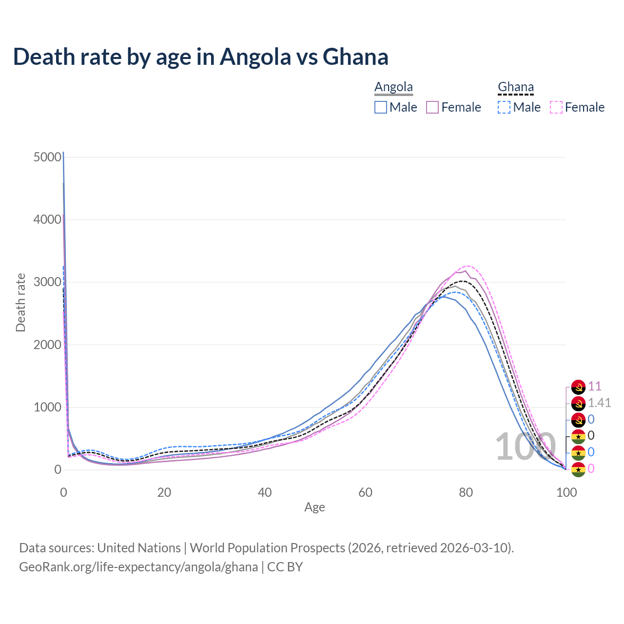 The average life expectancy at birth is 65.2 years in Angola vs 66.1 in Ghana. Angola is ranked 171/197 by life expectancy, and Ghana is 169/197. In Angola, the life expectancy is 62.6 years for males and 67.7 years for females. In Ghana, it's 63.7 years for males and 68.6 years for females.