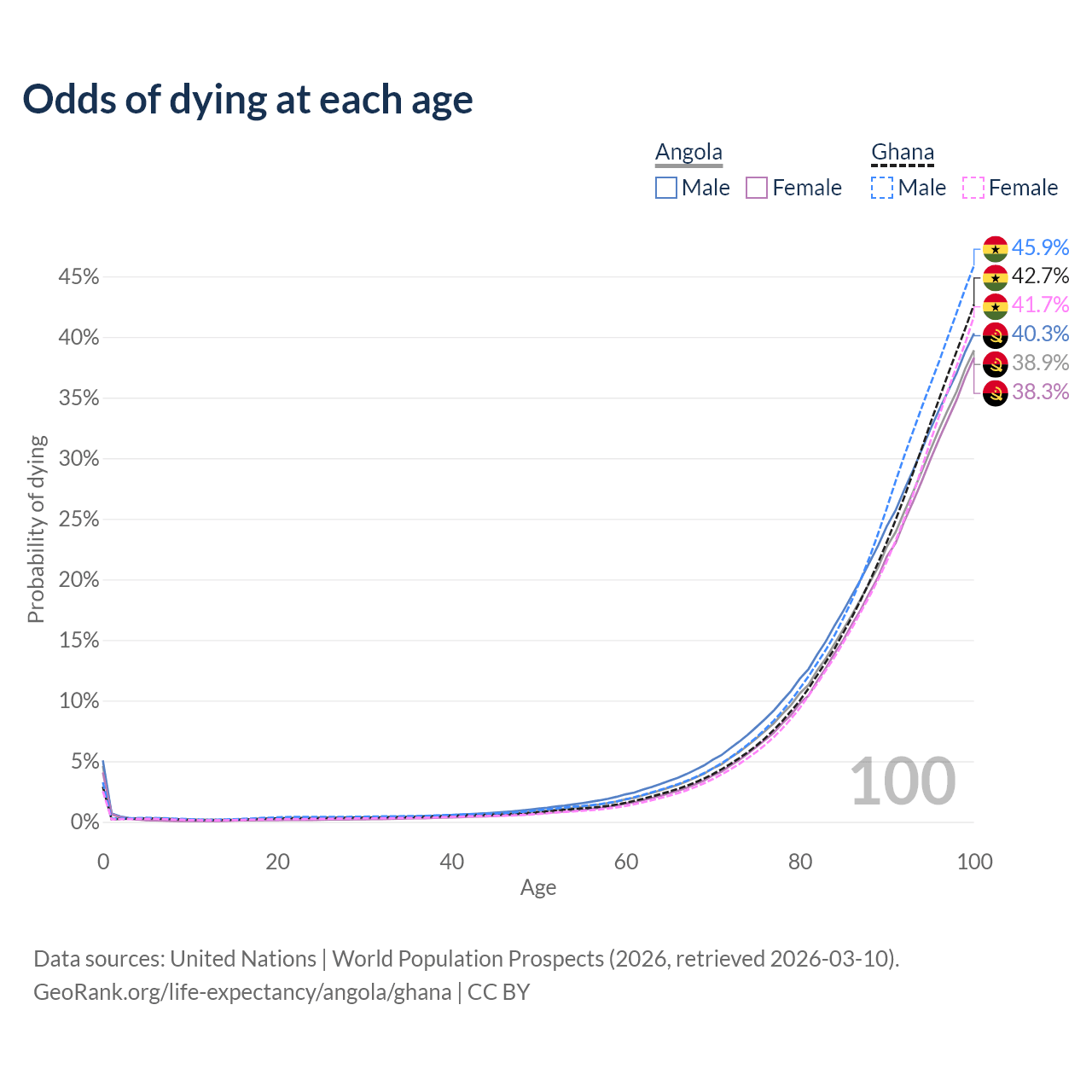 This life expectancy calculator shows the odds of living to 100, 95, 90, and below based on current age for both males and females in Angola and Ghana, along with mean and median age of death. The calculations are based on the 2026 life tables (actuarial tables) from the UN World Population Prospects.