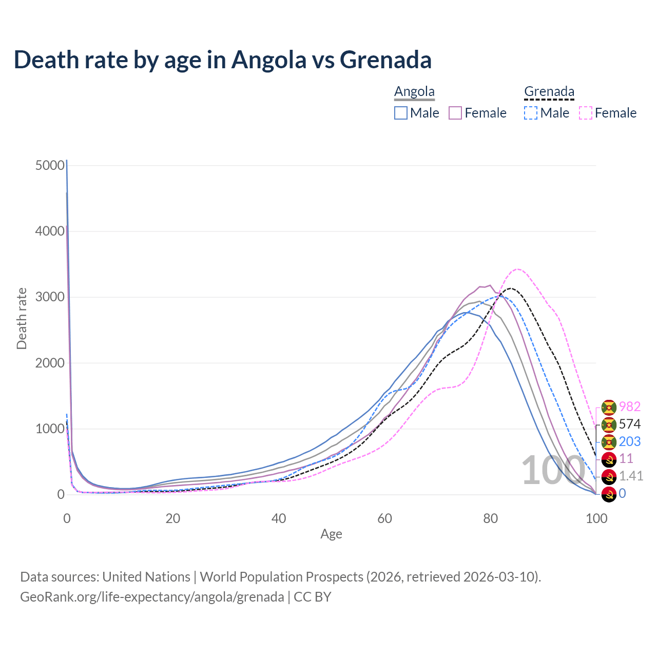 In Angola, the most common age of death is 0, compared to 84 in Grenada. The median age of death is 71.9 in Angola and 79.3 in Grenada, meaning only half of each cohort is expected to live past that age.