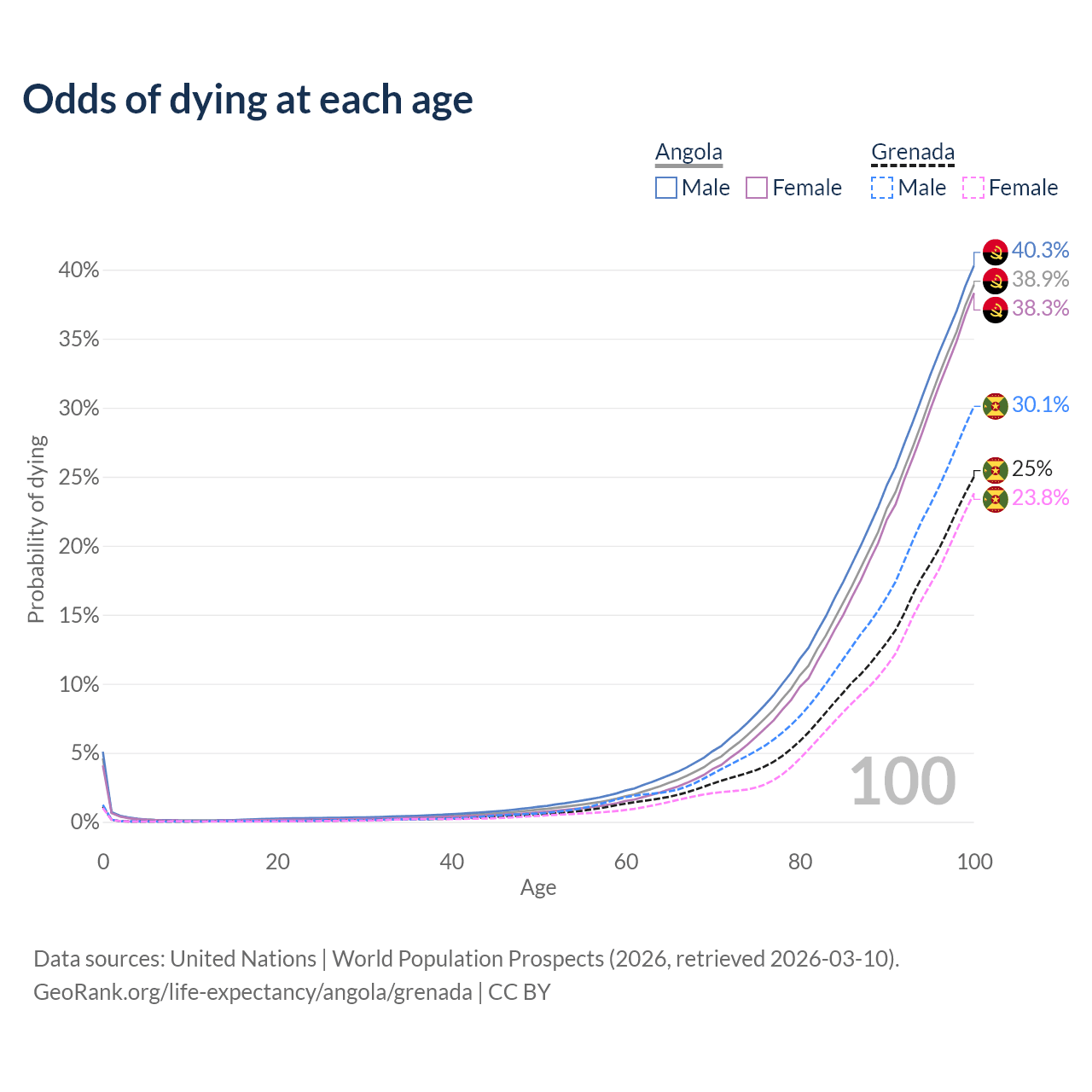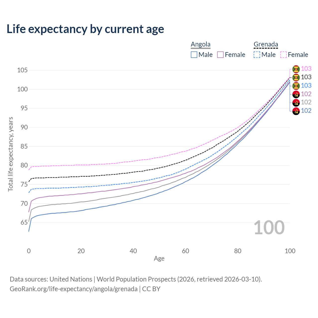 This life expectancy calculator shows the odds of living to 100, 95, 90, and below based on current age for both males and females in Angola and Grenada, along with mean and median age of death. The calculations are based on the 2026 life tables (actuarial tables) from the UN World Population Prospects.