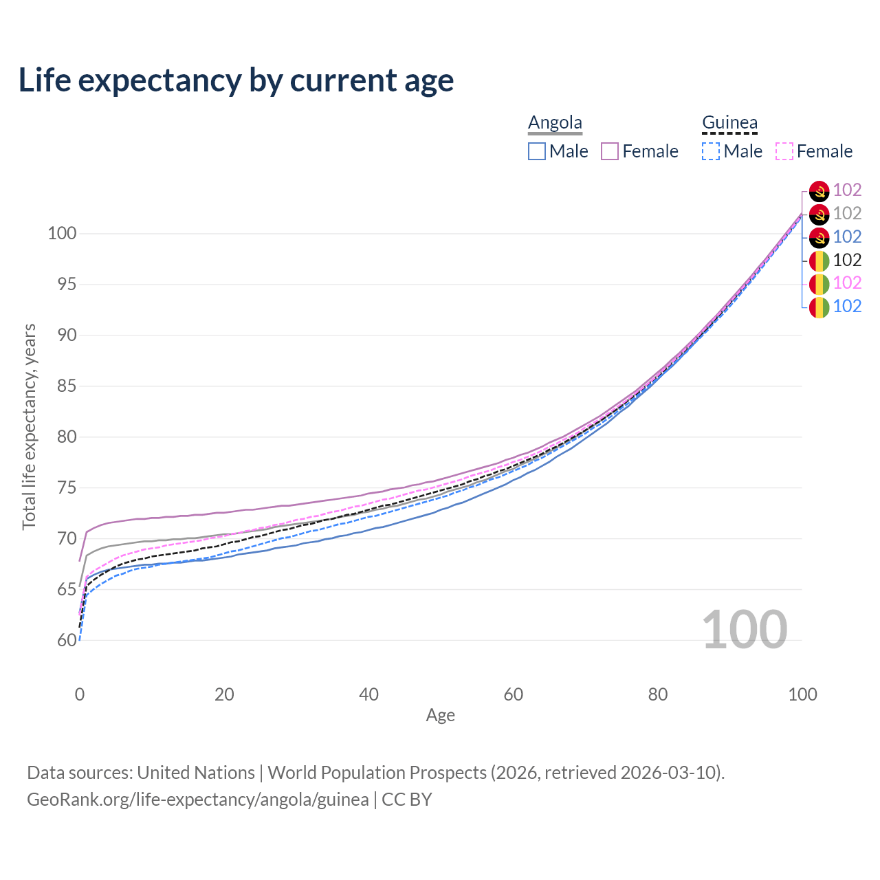 This life expectancy calculator shows the odds of living to 100, 95, 90, and below based on current age for both males and females in Angola and Guinea, along with mean and median age of death. The calculations are based on the 2026 life tables (actuarial tables) from the UN World Population Prospects.