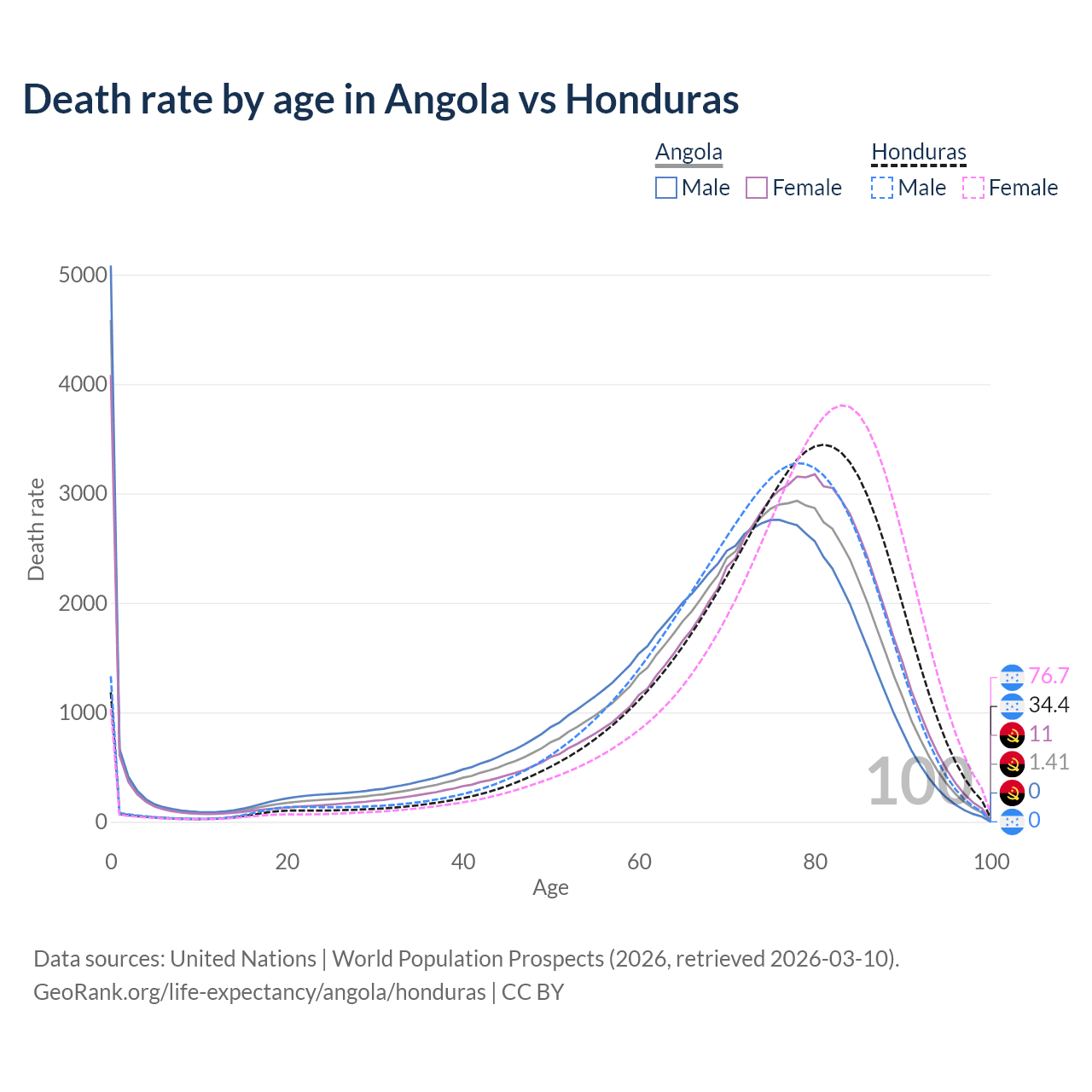 In Angola, the most common age of death is 0, compared to 81 in Honduras. The median age of death is 71.9 in Angola and 77.1 in Honduras, meaning only half of each cohort is expected to live past that age.