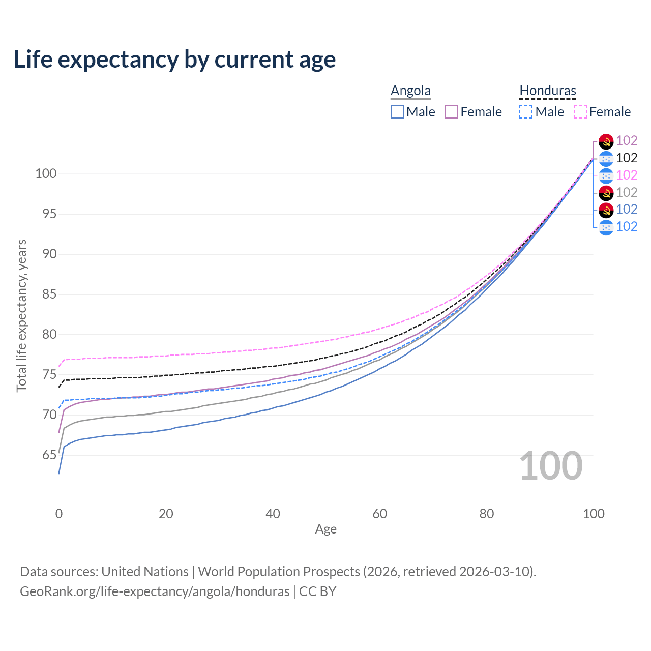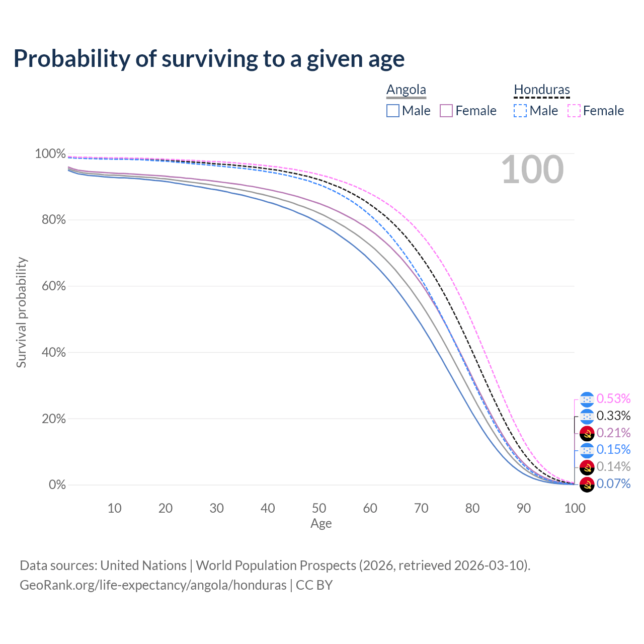 This life expectancy calculator shows the odds of living to 100, 95, 90, and below based on current age for both males and females in Angola and Honduras, along with mean and median age of death. The calculations are based on the 2026 life tables (actuarial tables) from the UN World Population Prospects.