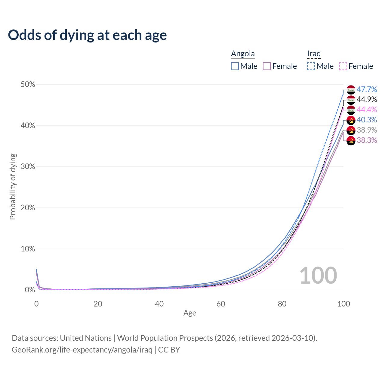 This life expectancy calculator shows the odds of living to 100, 95, 90, and below based on current age for both males and females in Angola and Iraq, along with mean and median age of death. The calculations are based on the 2026 life tables (actuarial tables) from the UN World Population Prospects.