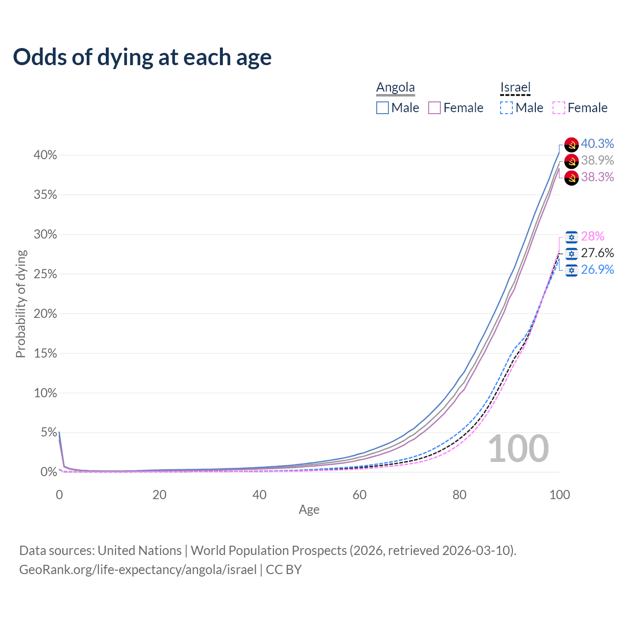 This life expectancy calculator shows the odds of living to 100, 95, 90, and below based on current age for both males and females in Angola and Israel, along with mean and median age of death. The calculations are based on the 2026 life tables (actuarial tables) from the UN World Population Prospects.