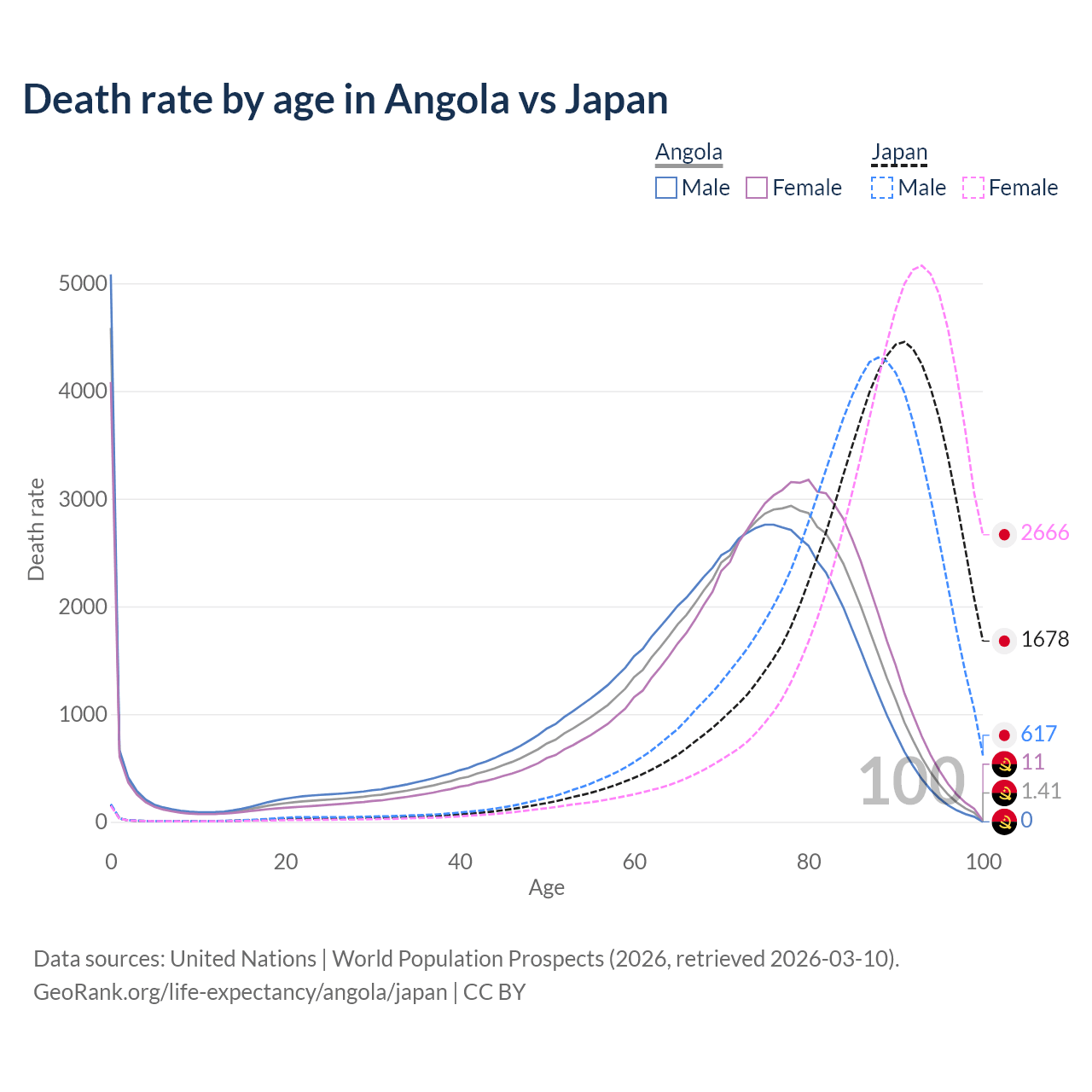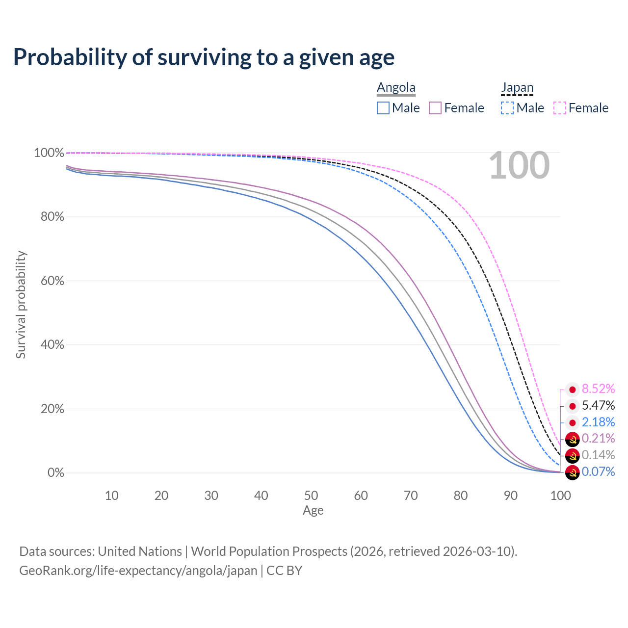 This life expectancy calculator shows the odds of living to 100, 95, 90, and below based on current age for both males and females in Angola and Japan, along with mean and median age of death. The calculations are based on the 2026 life tables (actuarial tables) from the UN World Population Prospects.