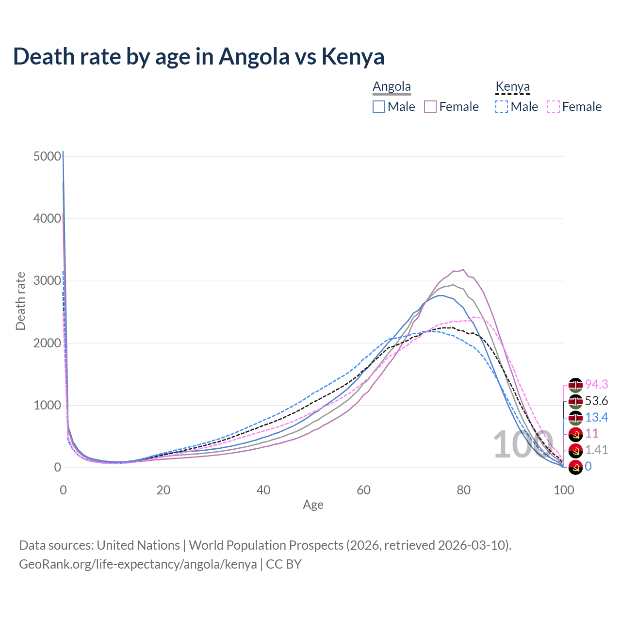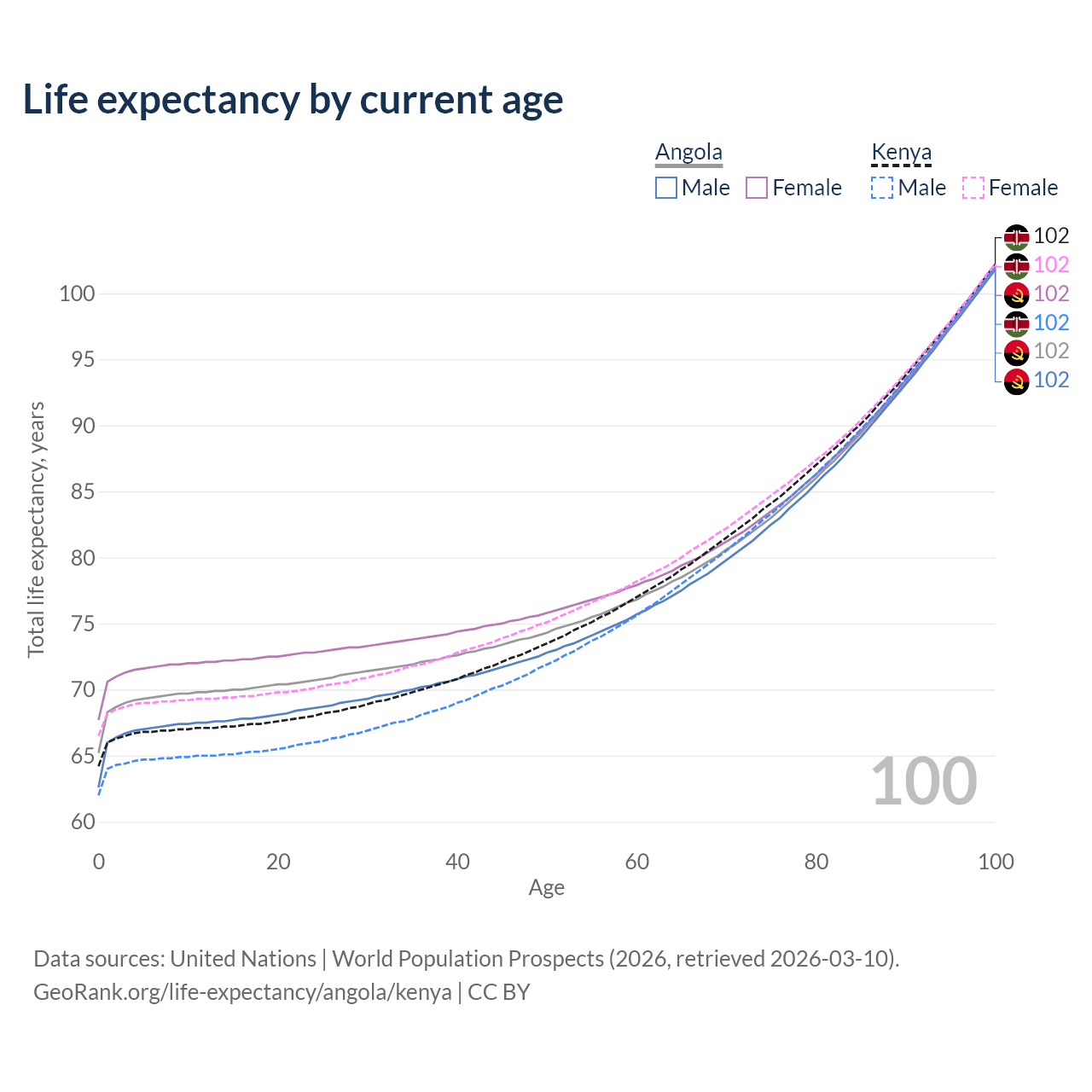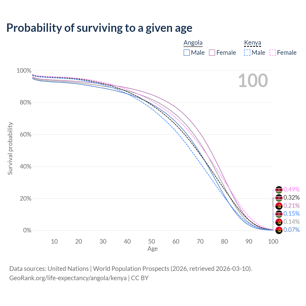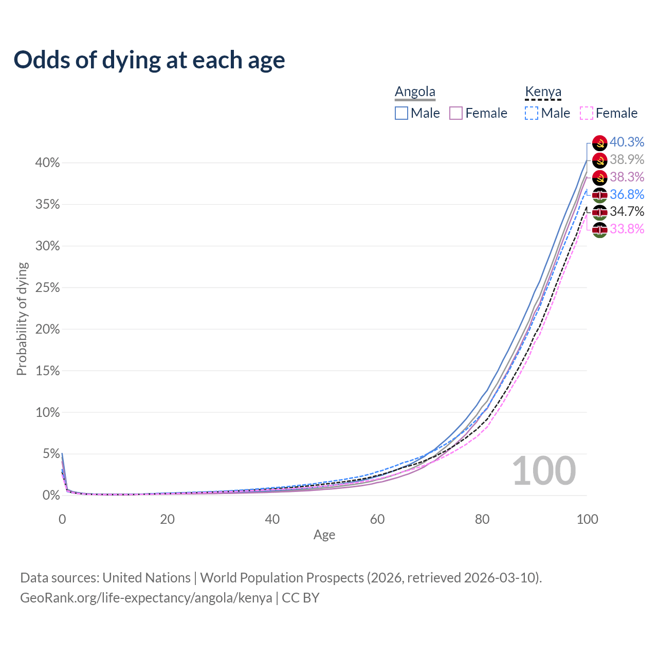 This life expectancy calculator shows the odds of living to 100, 95, 90, and below based on current age for both males and females in Angola and Kenya, along with mean and median age of death. The calculations are based on the 2026 life tables (actuarial tables) from the UN World Population Prospects.