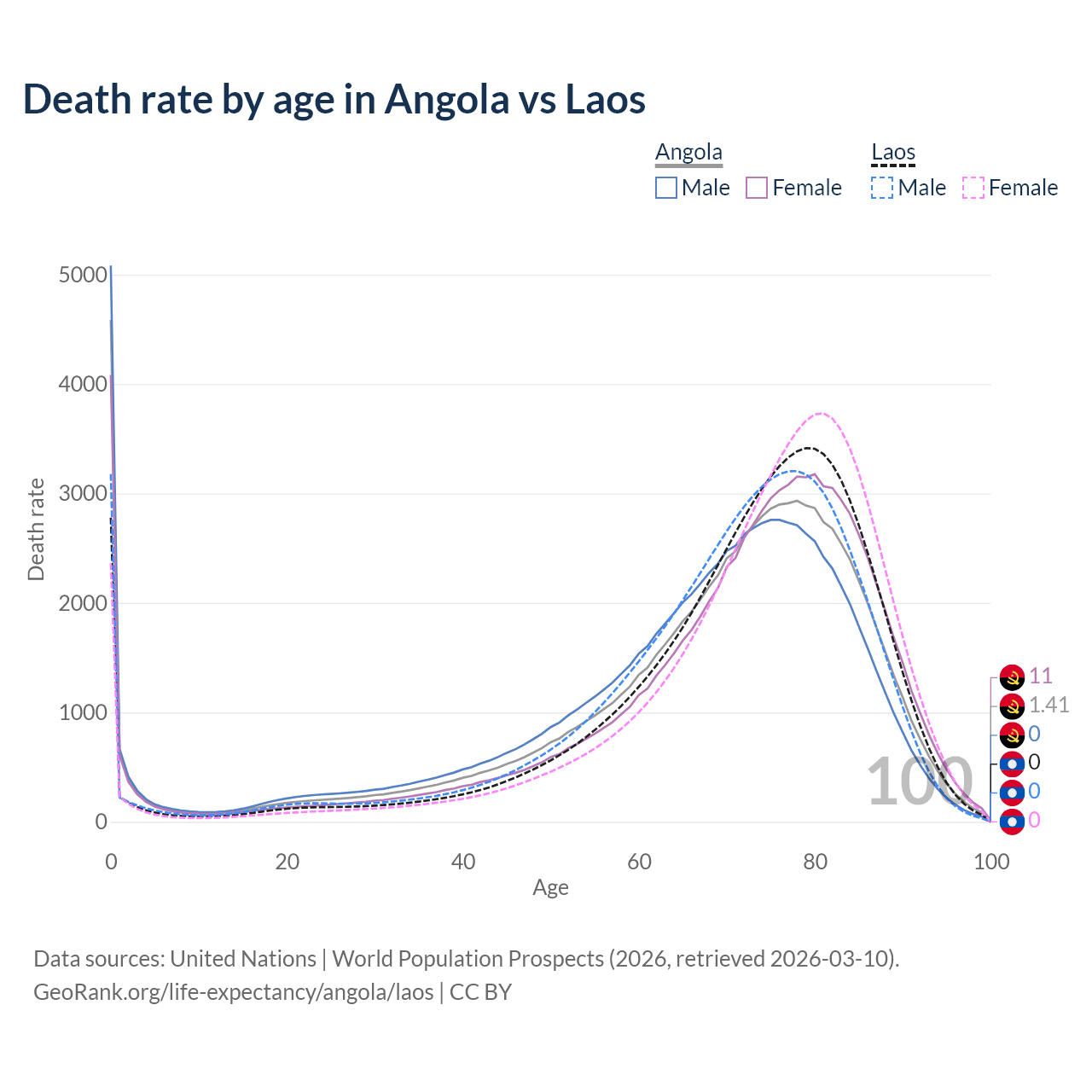 In Angola, the most common age of death is 0, compared to 79 in Laos. The median age of death is 71.9 in Angola and 74.7 in Laos, meaning only half of each cohort is expected to live past that age.
