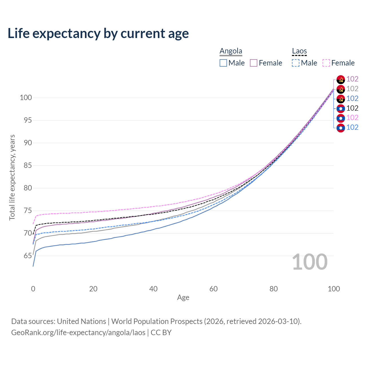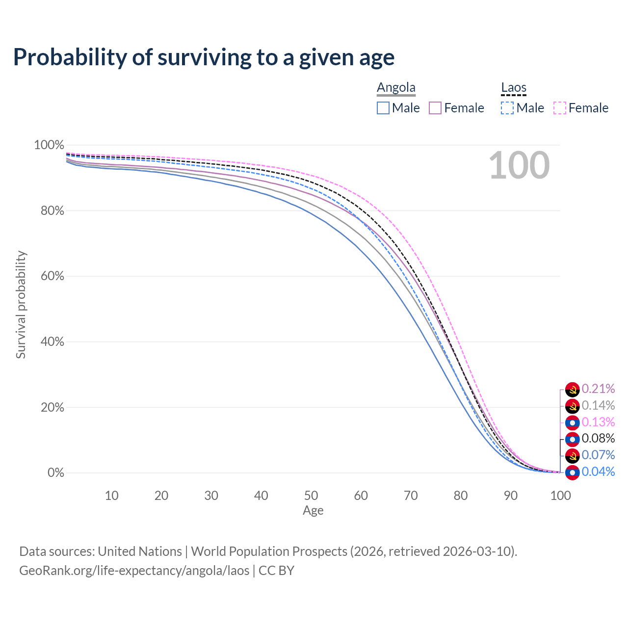This life expectancy calculator shows the odds of living to 100, 95, 90, and below based on current age for both males and females in Angola and Laos, along with mean and median age of death. The calculations are based on the 2026 life tables (actuarial tables) from the UN World Population Prospects.