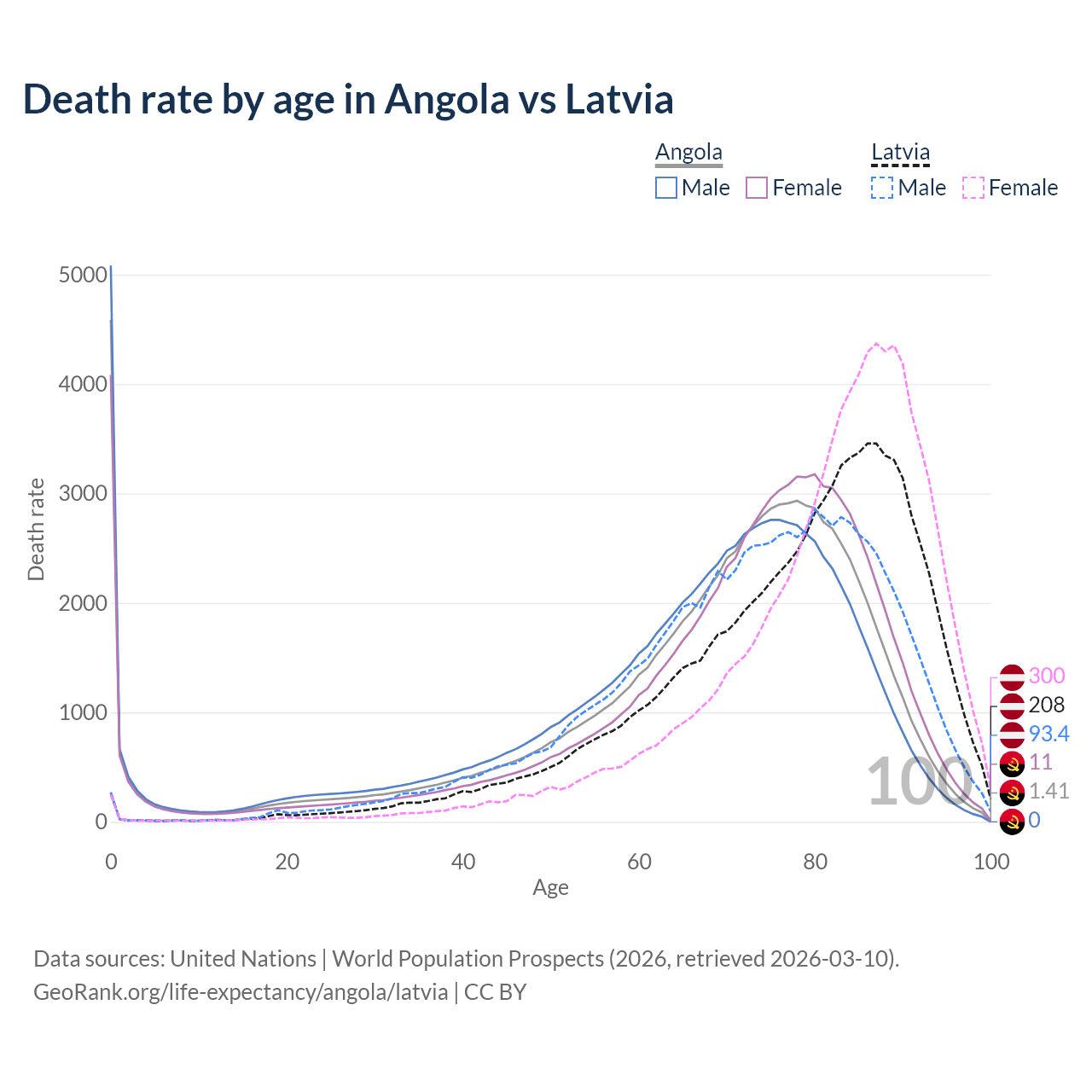 In Angola, the most common age of death is 0, compared to 87 in Latvia. The median age of death is 71.9 in Angola and 80.4 in Latvia, meaning only half of each cohort is expected to live past that age.