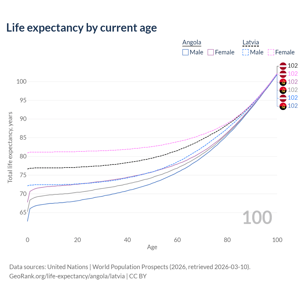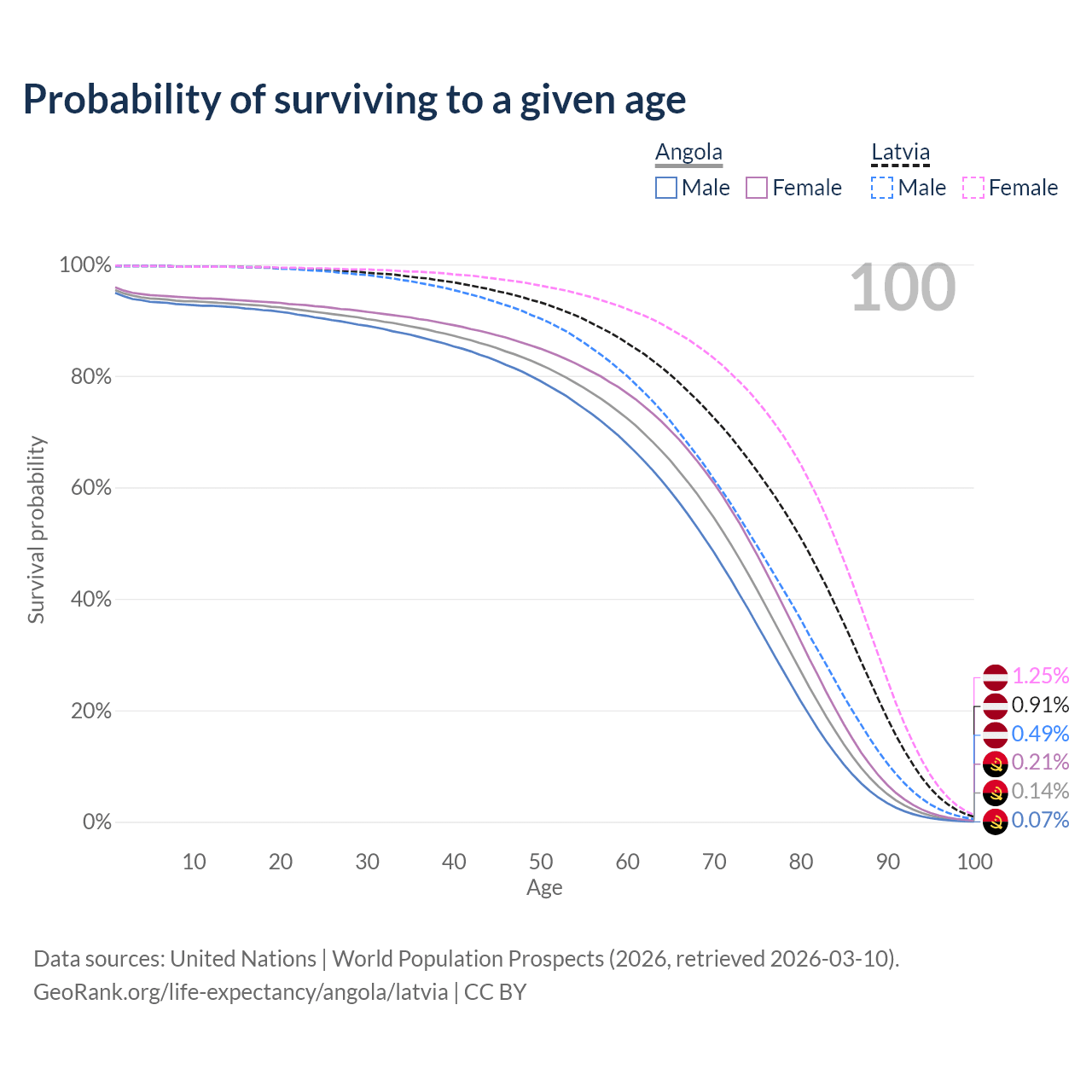 This life expectancy calculator shows the odds of living to 100, 95, 90, and below based on current age for both males and females in Angola and Latvia, along with mean and median age of death. The calculations are based on the 2026 life tables (actuarial tables) from the UN World Population Prospects.