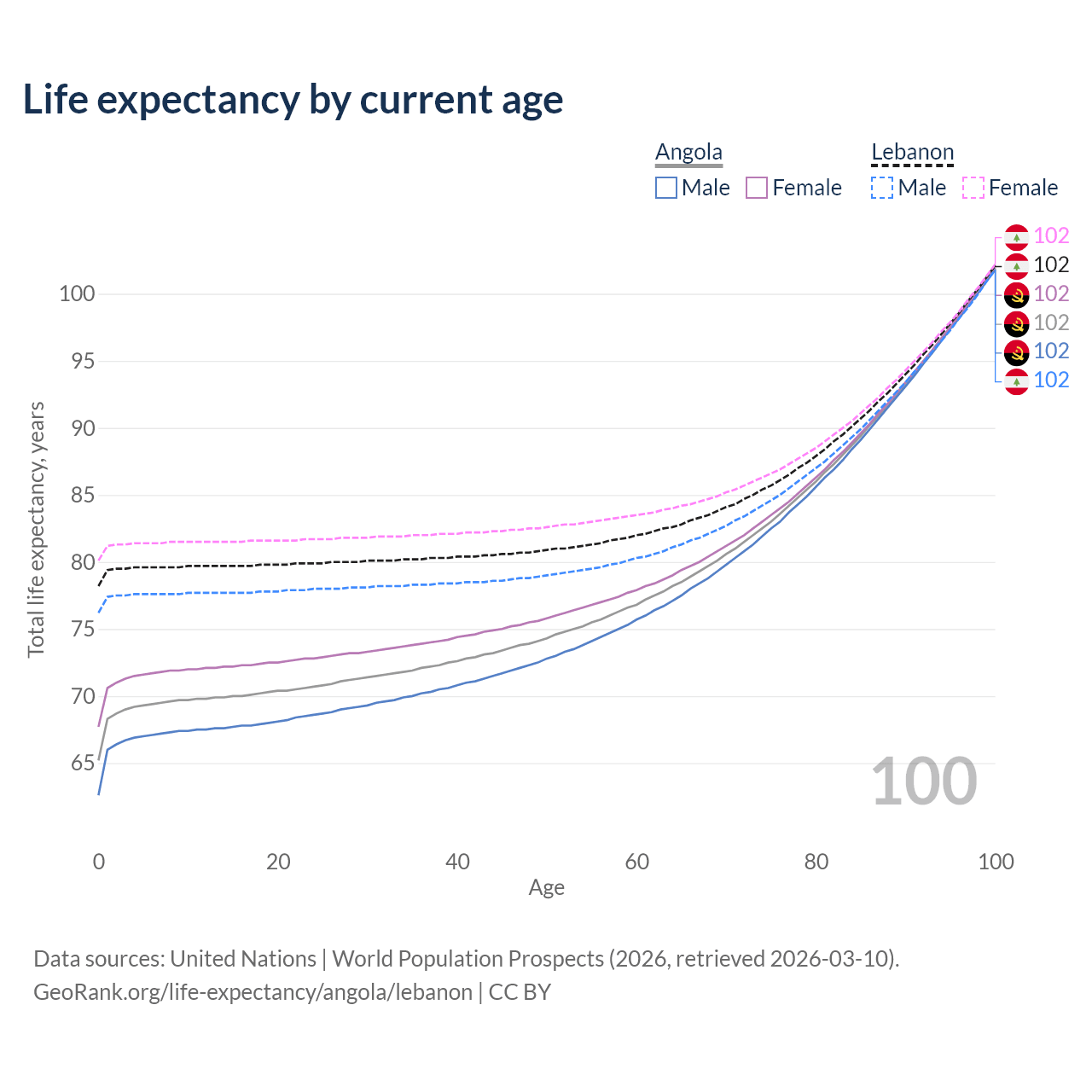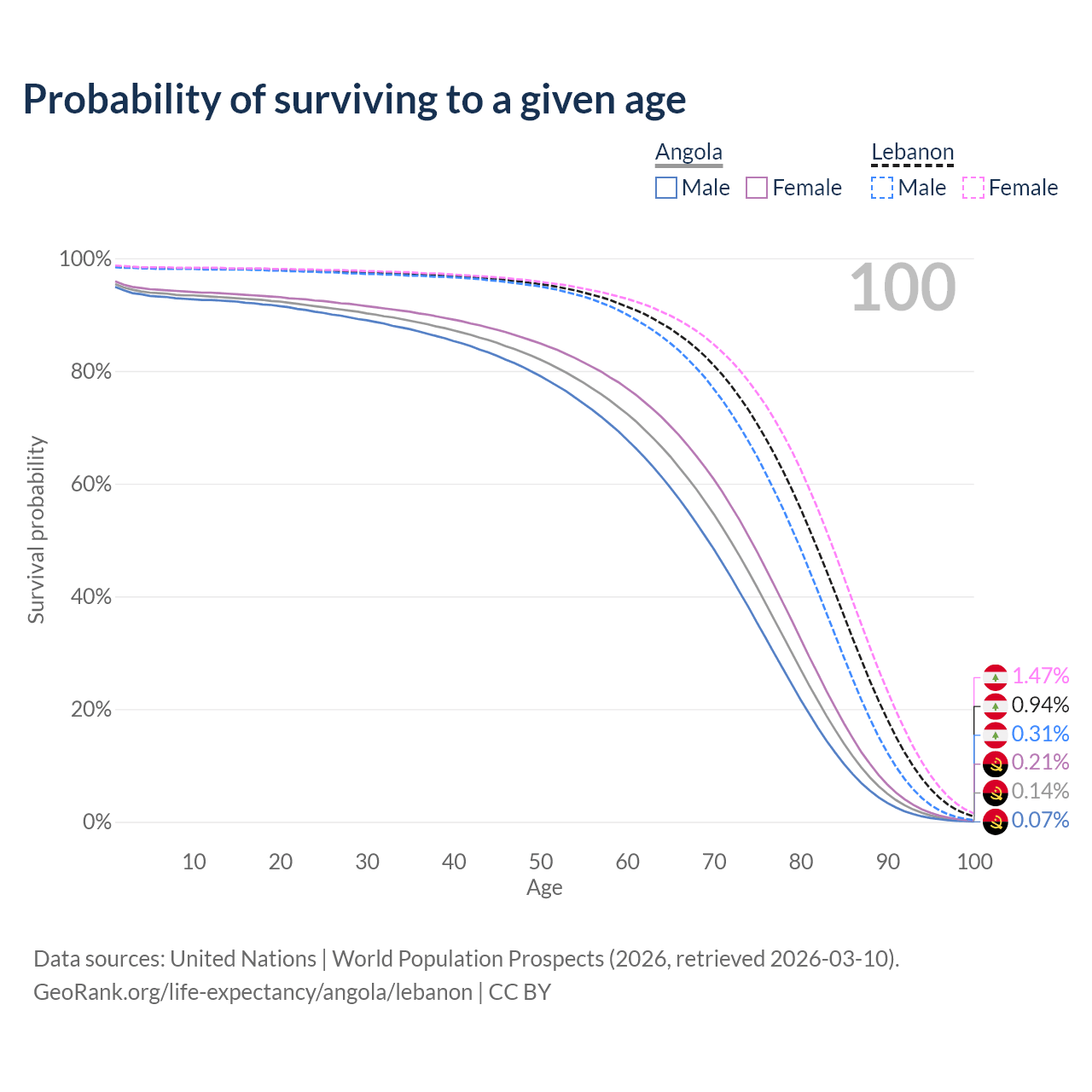 This life expectancy calculator shows the odds of living to 100, 95, 90, and below based on current age for both males and females in Angola and Lebanon, along with mean and median age of death. The calculations are based on the 2026 life tables (actuarial tables) from the UN World Population Prospects.