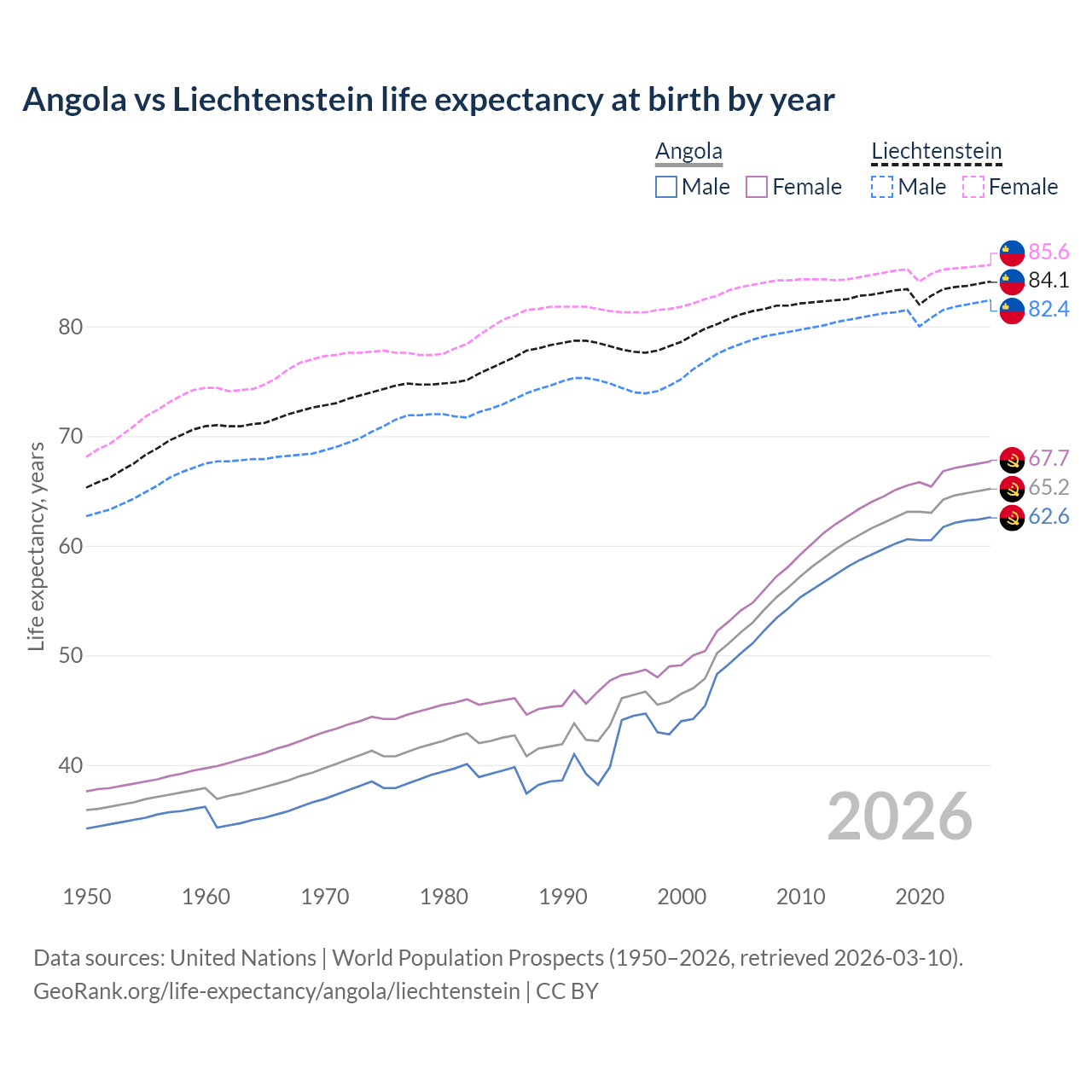 The average life expectancy at birth is 65.2 years in Angola vs 84.1 in Liechtenstein. Angola is ranked 171/197 by life expectancy, and Liechtenstein is 11/197. In Angola, the life expectancy is 62.6 years for males and 67.7 years for females. In Liechtenstein, it's 82.4 years for males and 85.6 years for females.