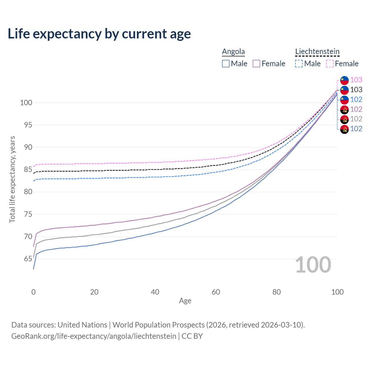 This life expectancy calculator shows the odds of living to 100, 95, 90, and below based on current age for both males and females in Angola and Liechtenstein, along with mean and median age of death. The calculations are based on the 2026 life tables (actuarial tables) from the UN World Population Prospects.